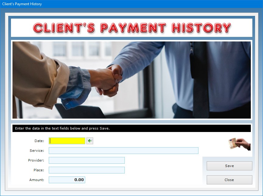 After saving the record, pressing the Payment History button gives you access to a window where you can list and print all payments made by the client to your company for the services received. To add a payment to the list, just press the Add payment button, fill in the text fields in the window that appears, press Save and then Close. For each payment you must indicate the date, the type of service, the service provider (e.g. the name of your company's agent who served the client), the place where the service was provided, and the amount paid.