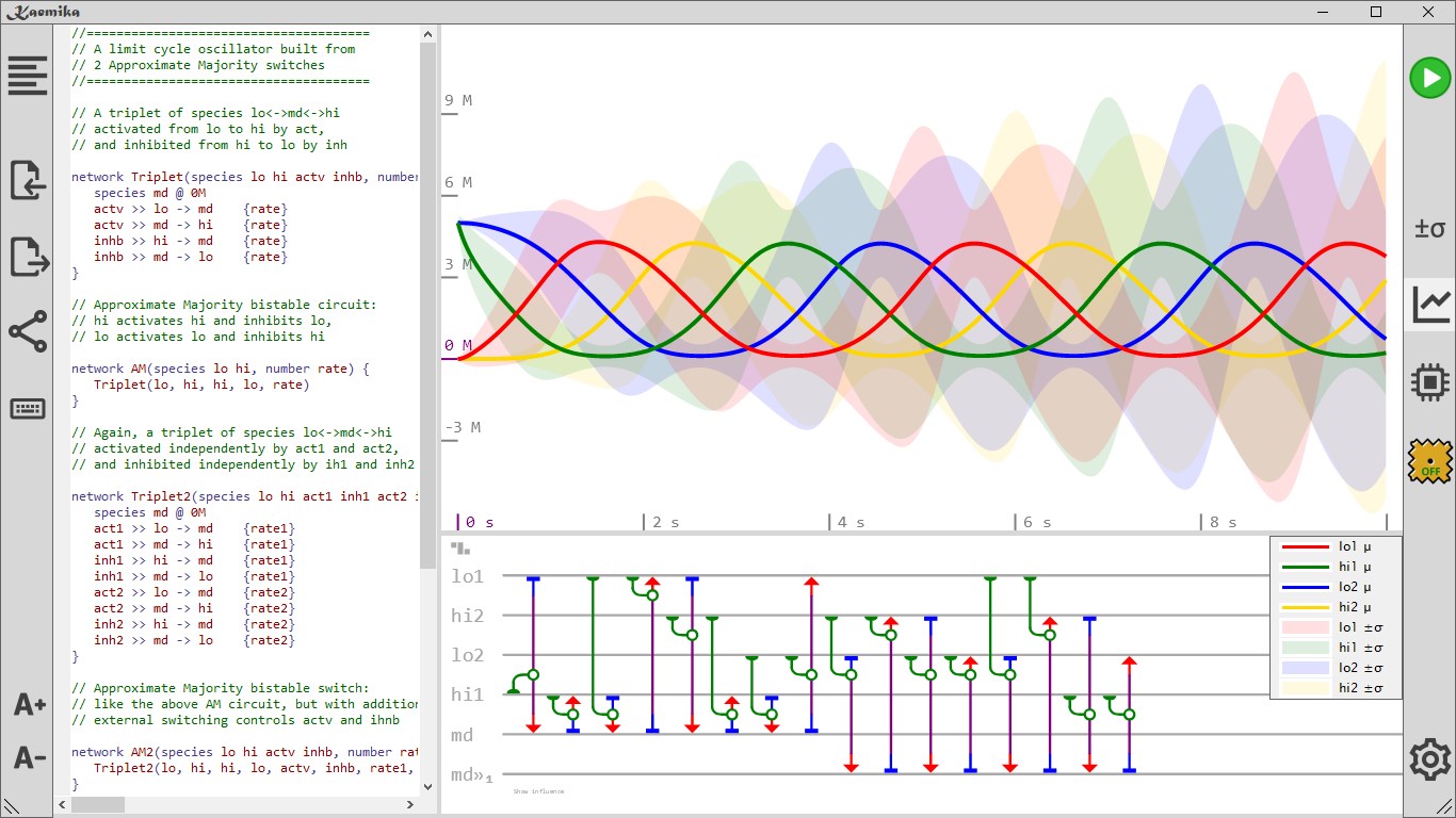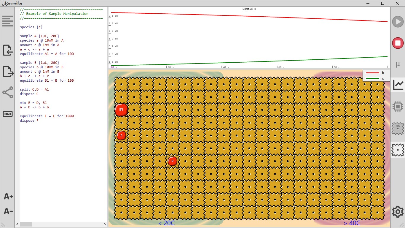 Chemical reaction networks.Liquid handling protocols.Functional, nominal, monadic language.Deterministic and Linear Noise Approximation simulation.Digital microfluidics simulation.