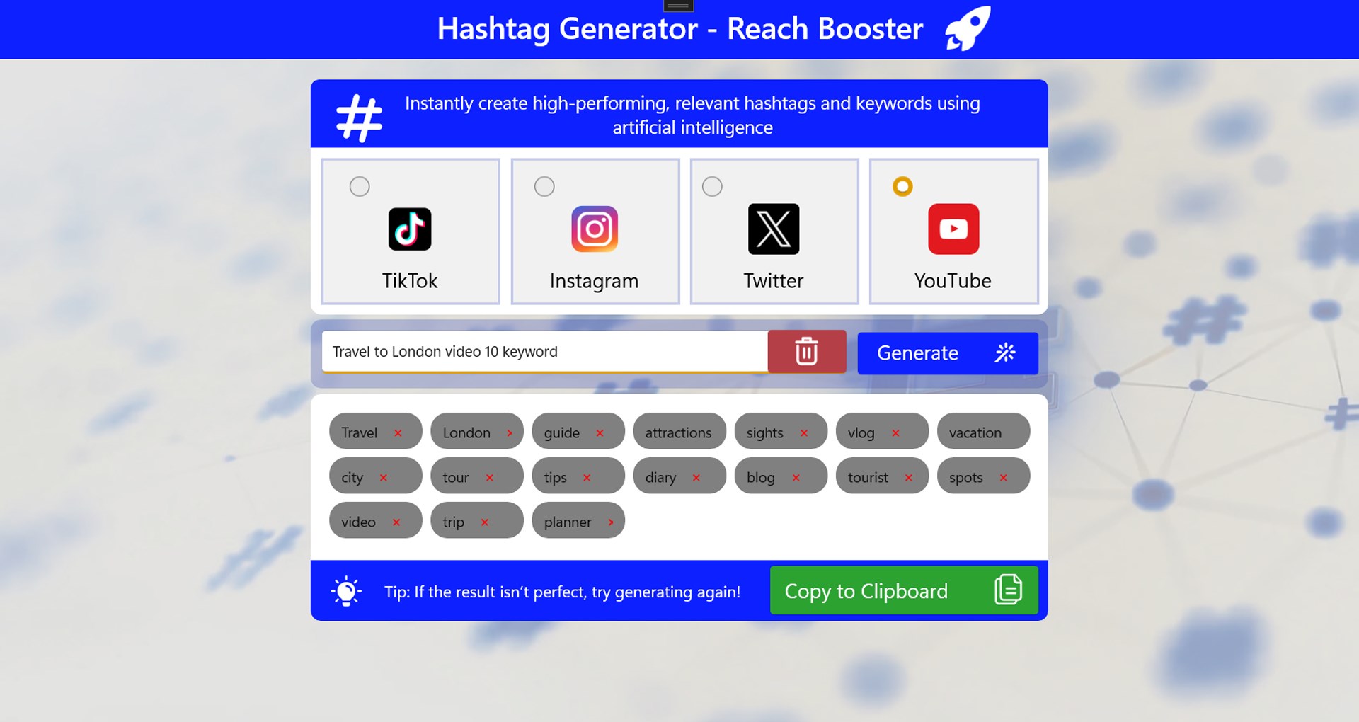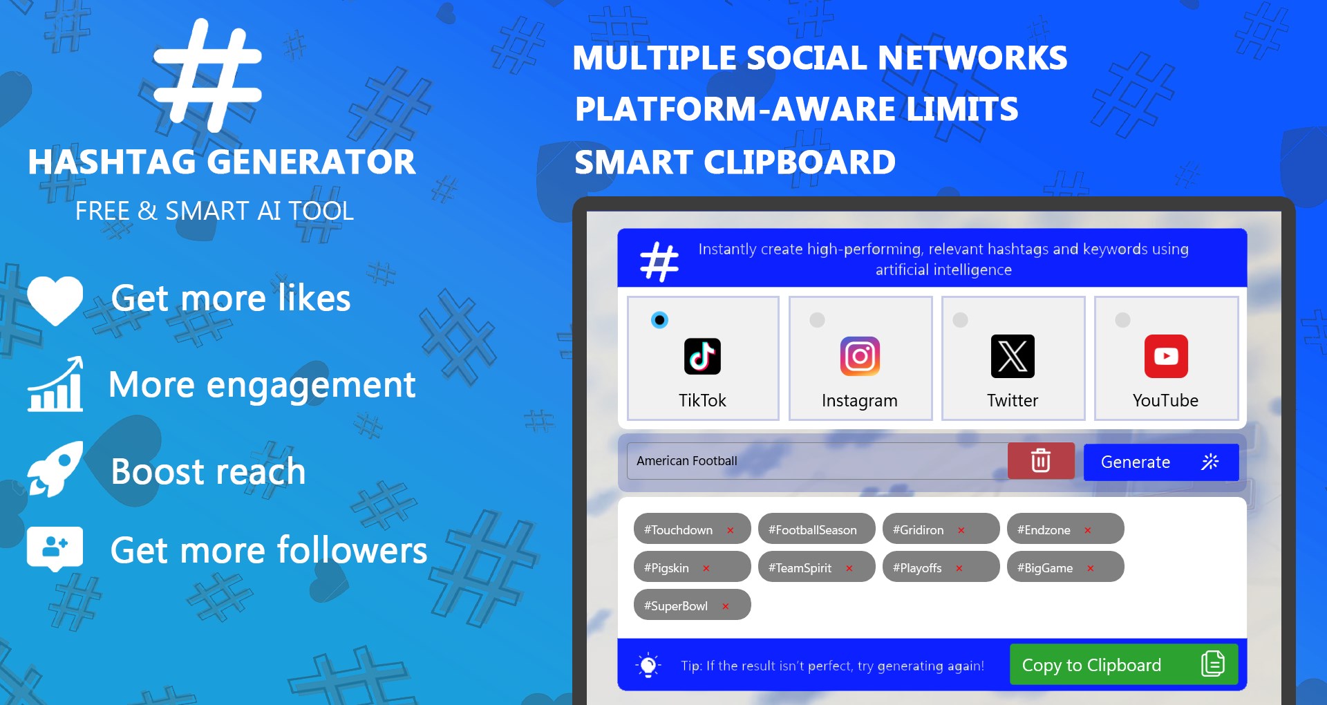 Disclaimer: Hashtag Generator - Reach Booster is an independent tool and is not affiliated with Instagram, TikTok, YouTube, X (Twitter), or any other platform.