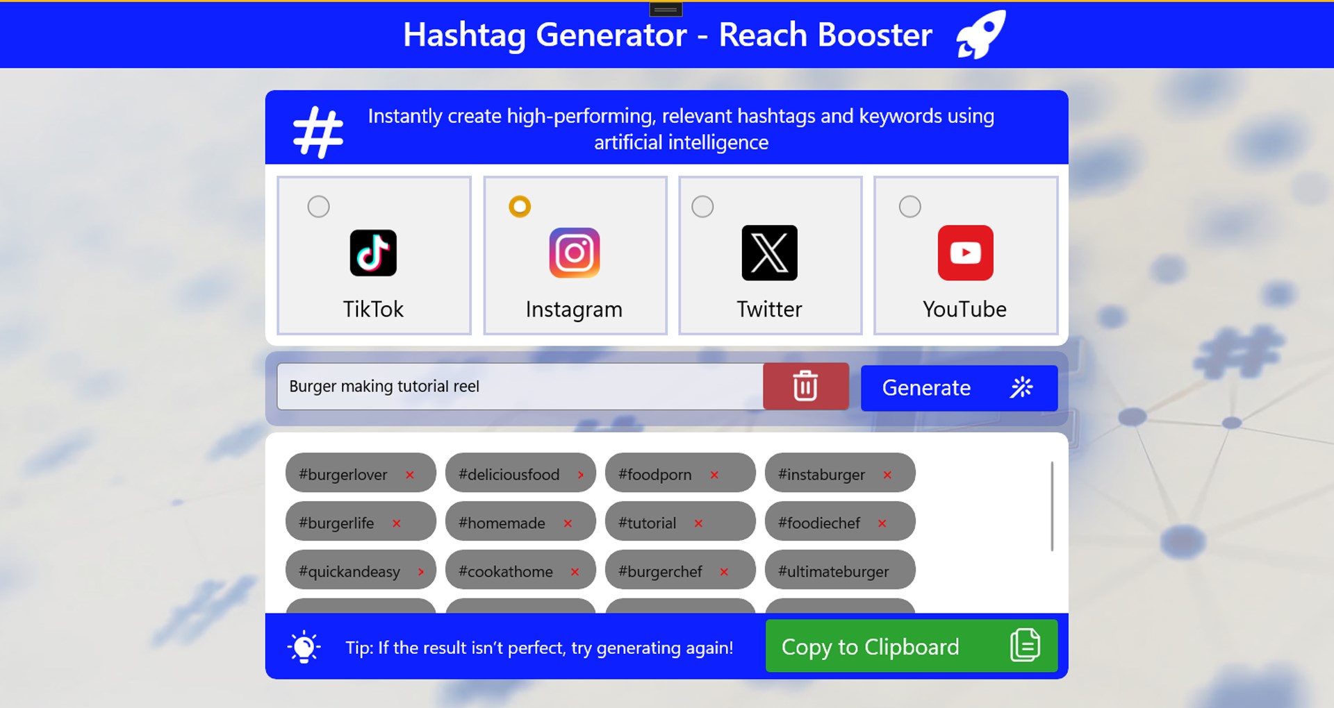 Hashtag Generator - Reach Booster Reach Expander is your smart AI-powered assistant for generating the most trending, niche-relevant, and creative hashtags and keywords to help your content reach the right audience and go viral.