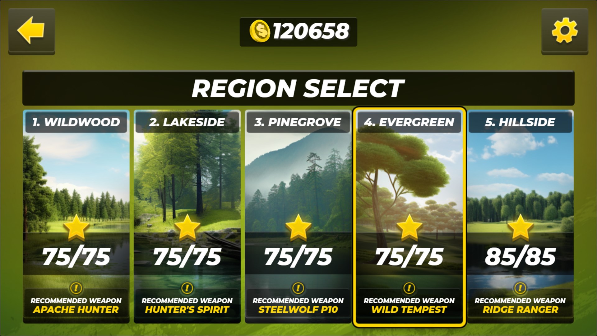 Shoot the animals and collect their trophies in all the different levels to progress to the next region. Unlock and upgrade your hunting gear using the gold you get as a reward.