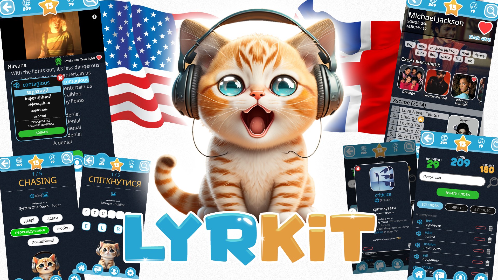 Lyrkit - це 1 000 000 пісень із відео та текстами що об'єднались в одну захоплюючу гру по вивченню англійської мови. Не втрачай часу, починай вивчати англійську мову за допомогою Lyrkit вже сьогодні! Музика - це ключ до неймовірного світу мовного розвитку, а Lyrkit – твій ідеальний у цьому помічник!