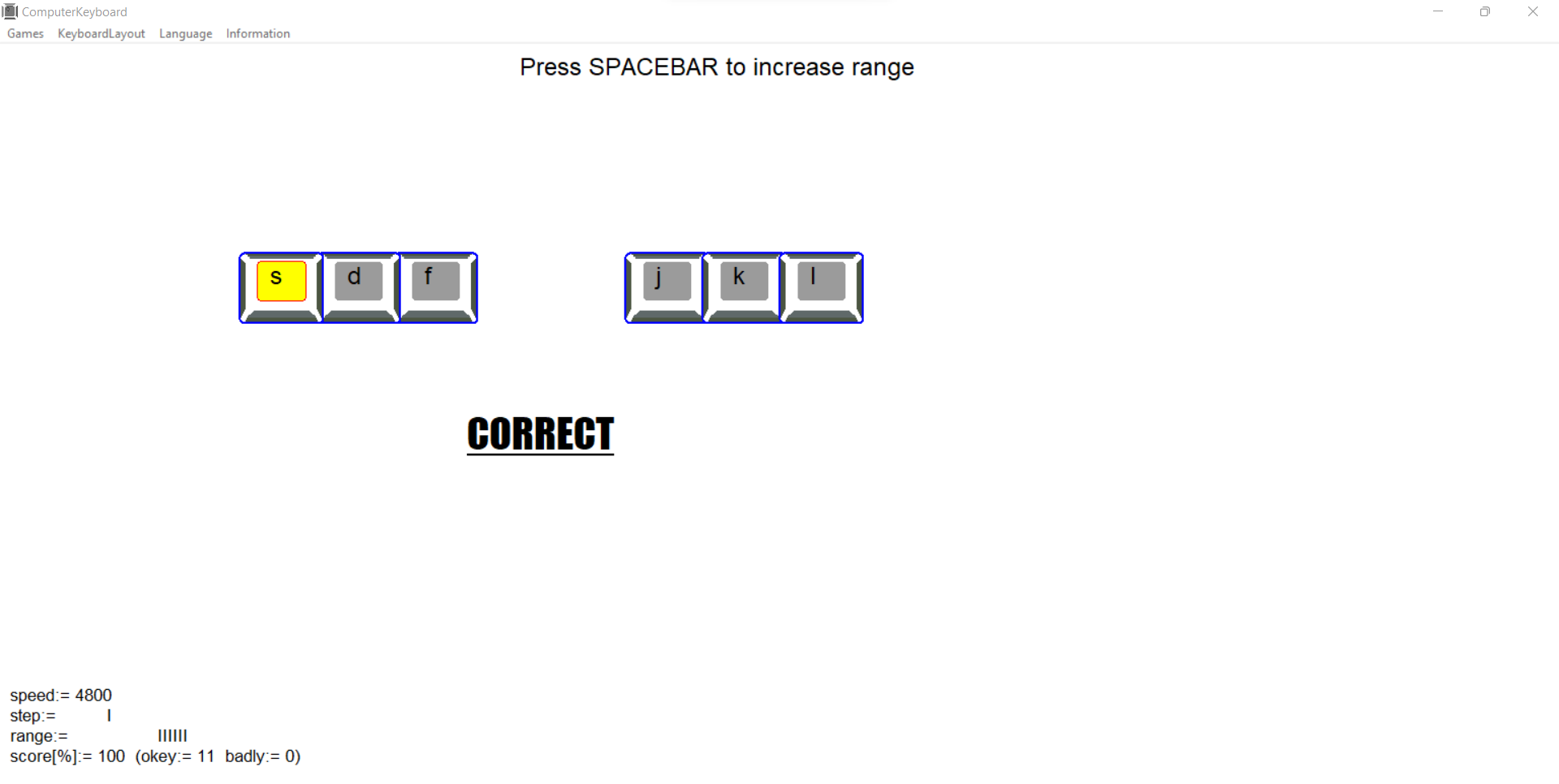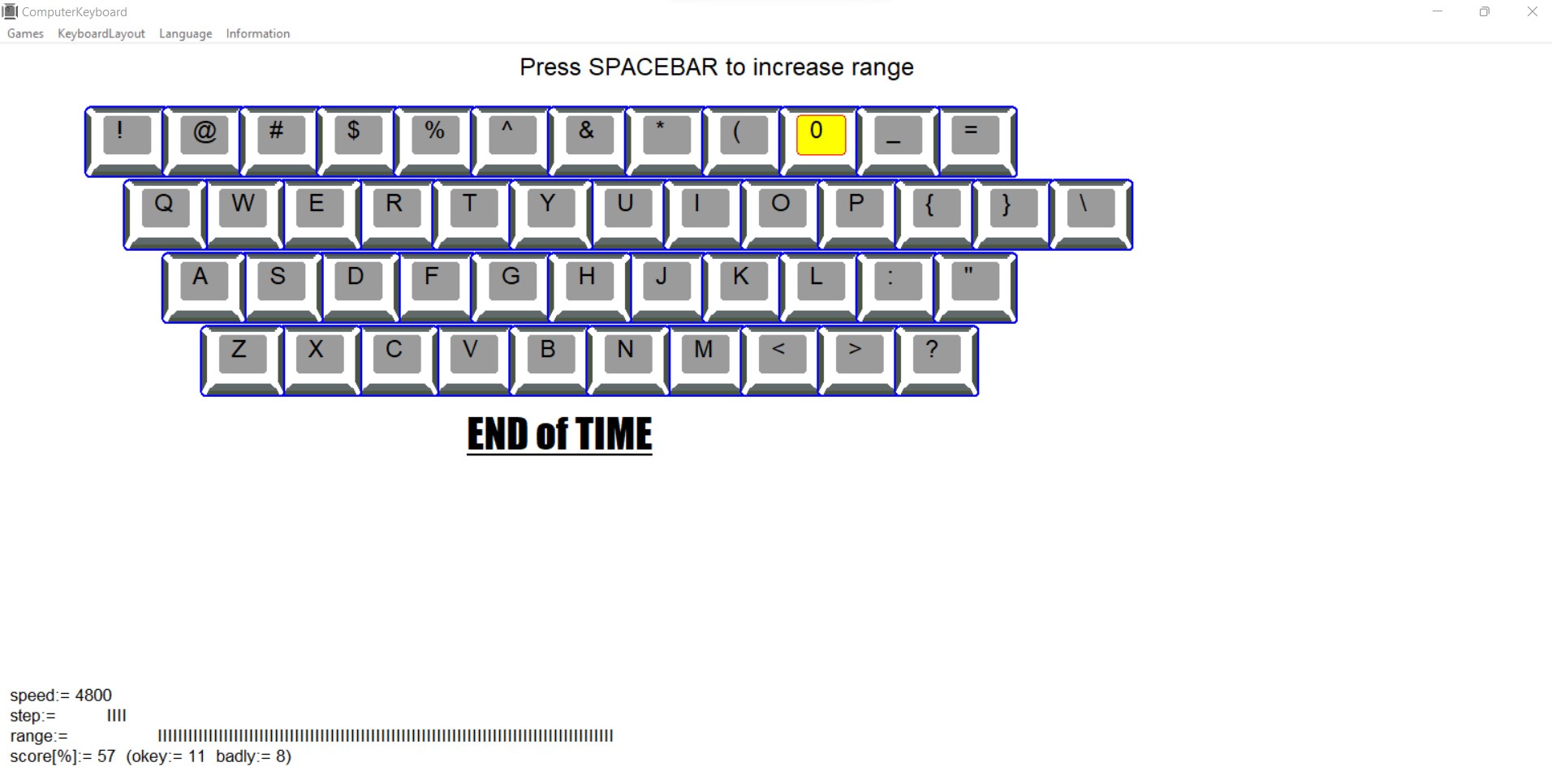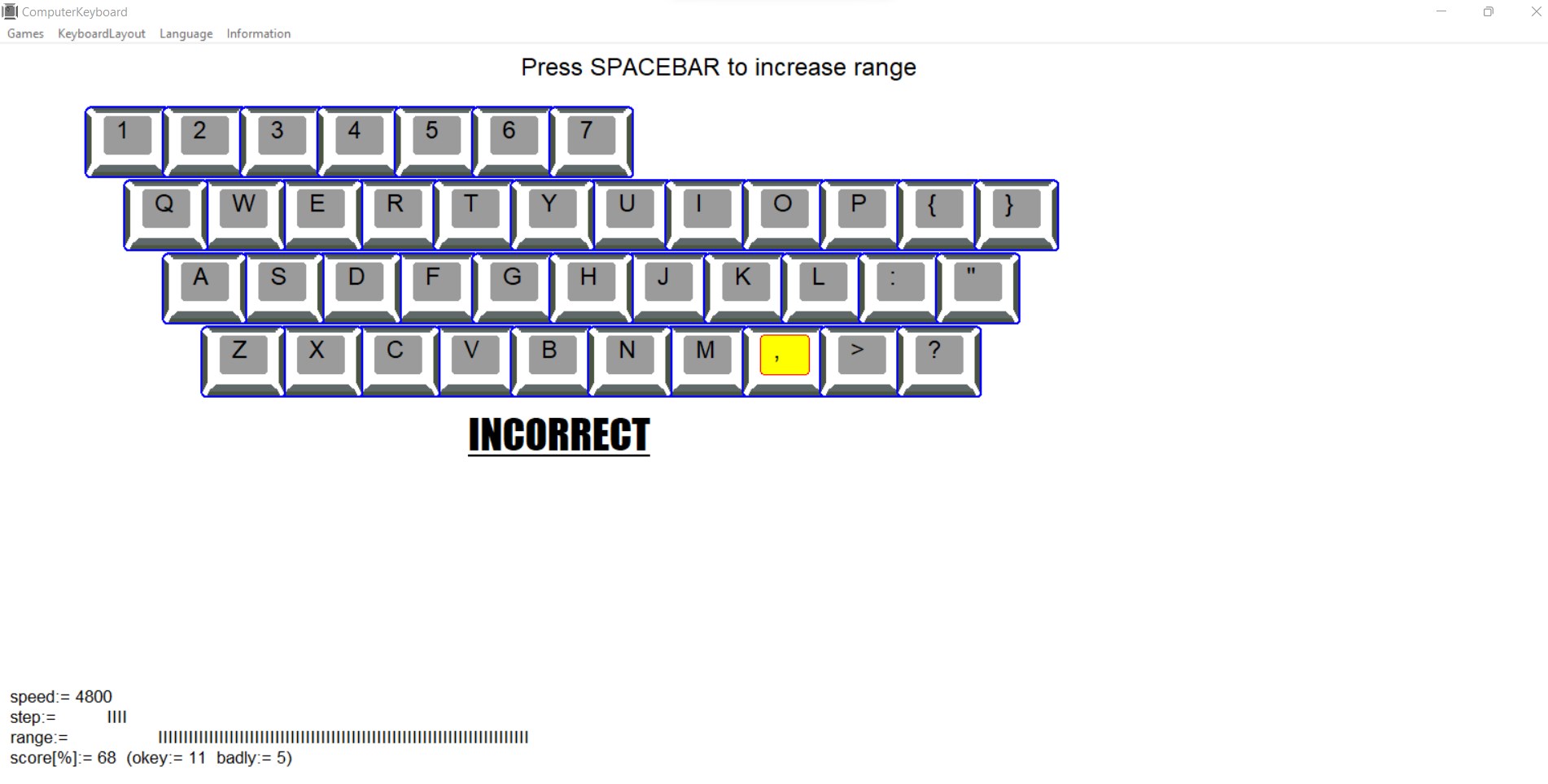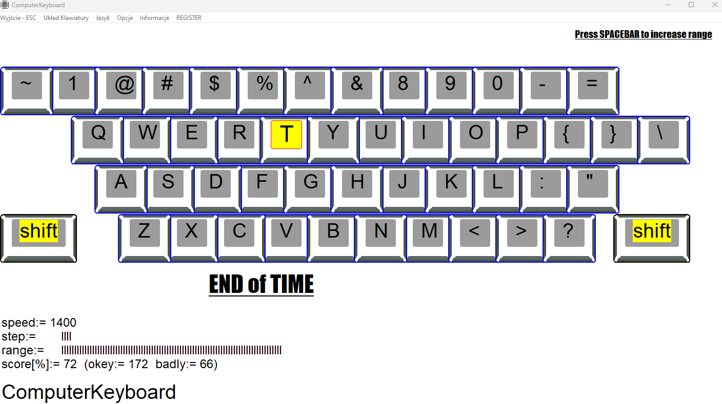 you start your adventure with ComputerKeyboard with four basic keys. As you progress, the number of keys increases - the time needed to press the appropriate key also decreases. Giving a wrong answer reduces the number of keys. You can increase the range of available keys at any time.