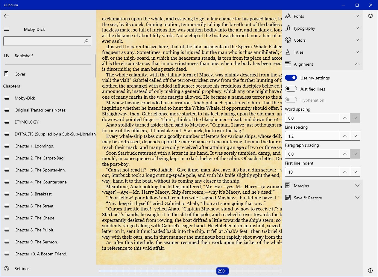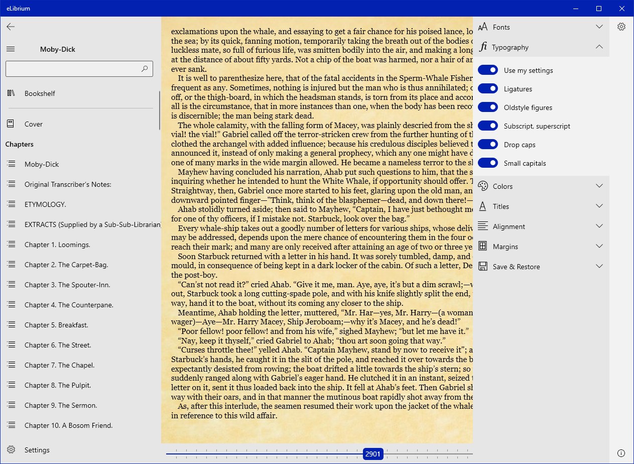 Read all your ePub books (versions 2 and 3 supported) with a reader that focuses on the book. Perfect typography right out of the box, even if the book you read was never prepared with typographical finesse in mind. But if you want to customize it to suit your fancy, it's your call.