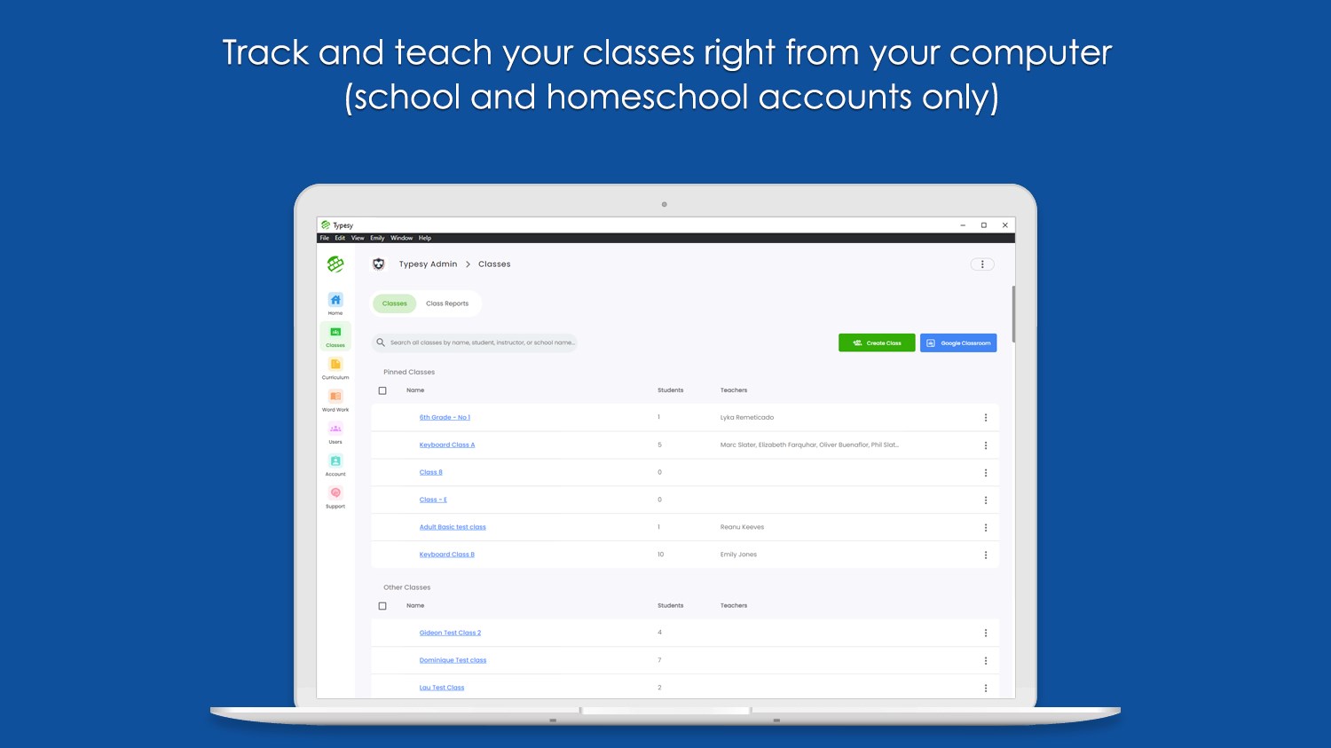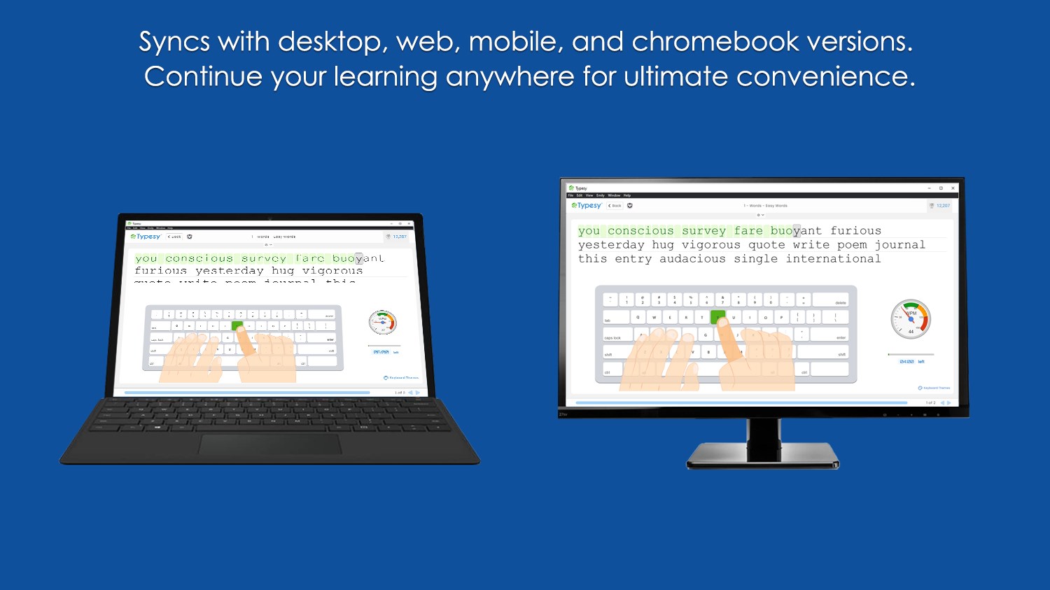 Typesy stores everything in the cloud and all your computers automatically stay in sync. You get unlimited installs on all your Windows, Mac, Linux, and Chrome machines. Start training on one computer, and continue right where you left off on the next. You can share typing exercises with friends, work in groups, and even share your success on Facebook.