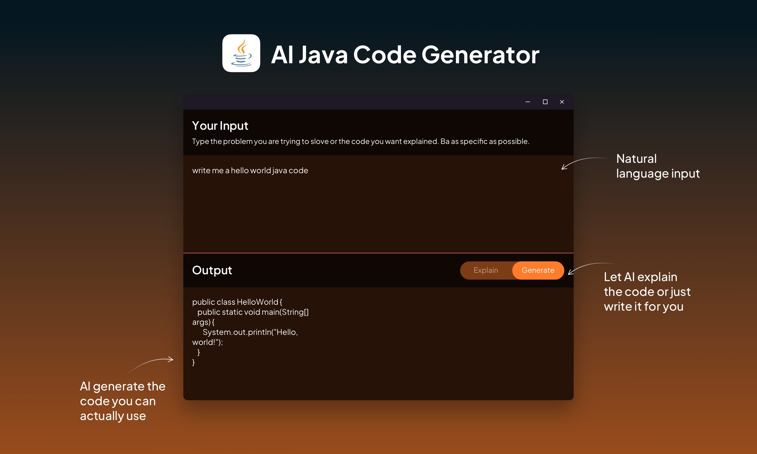 A powerful app that utilizes artificial intelligence to generate high-quality Java code in a matter of seconds.