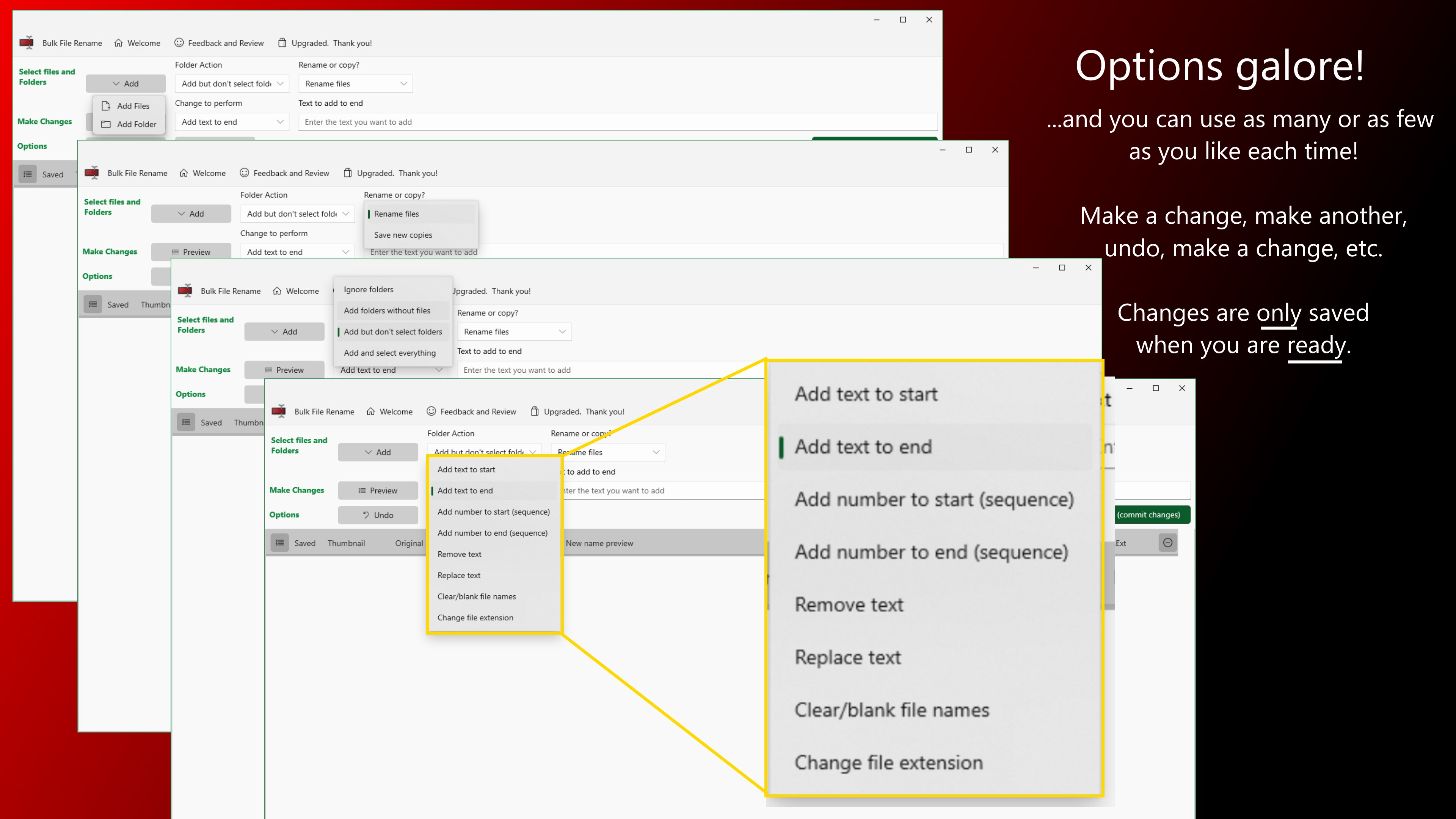 Replace (Rename existing)Save as new copyAdd Text to start or end of file namesRemove text from allAdd a Number SequenceDrag and DropChange File ExtensionsUndo