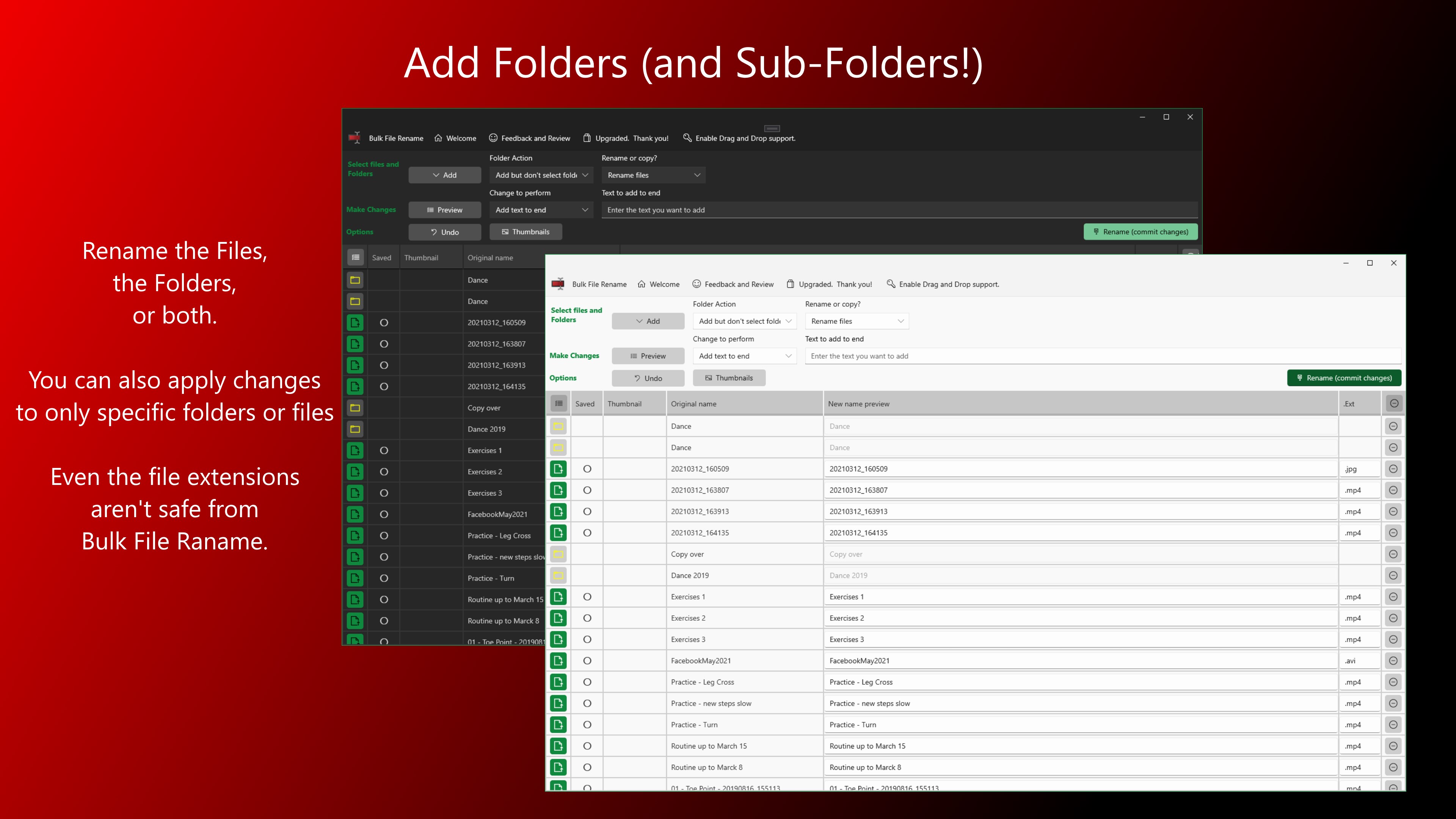 Add files from any folder (even multiple folders!) and rename them all at once.