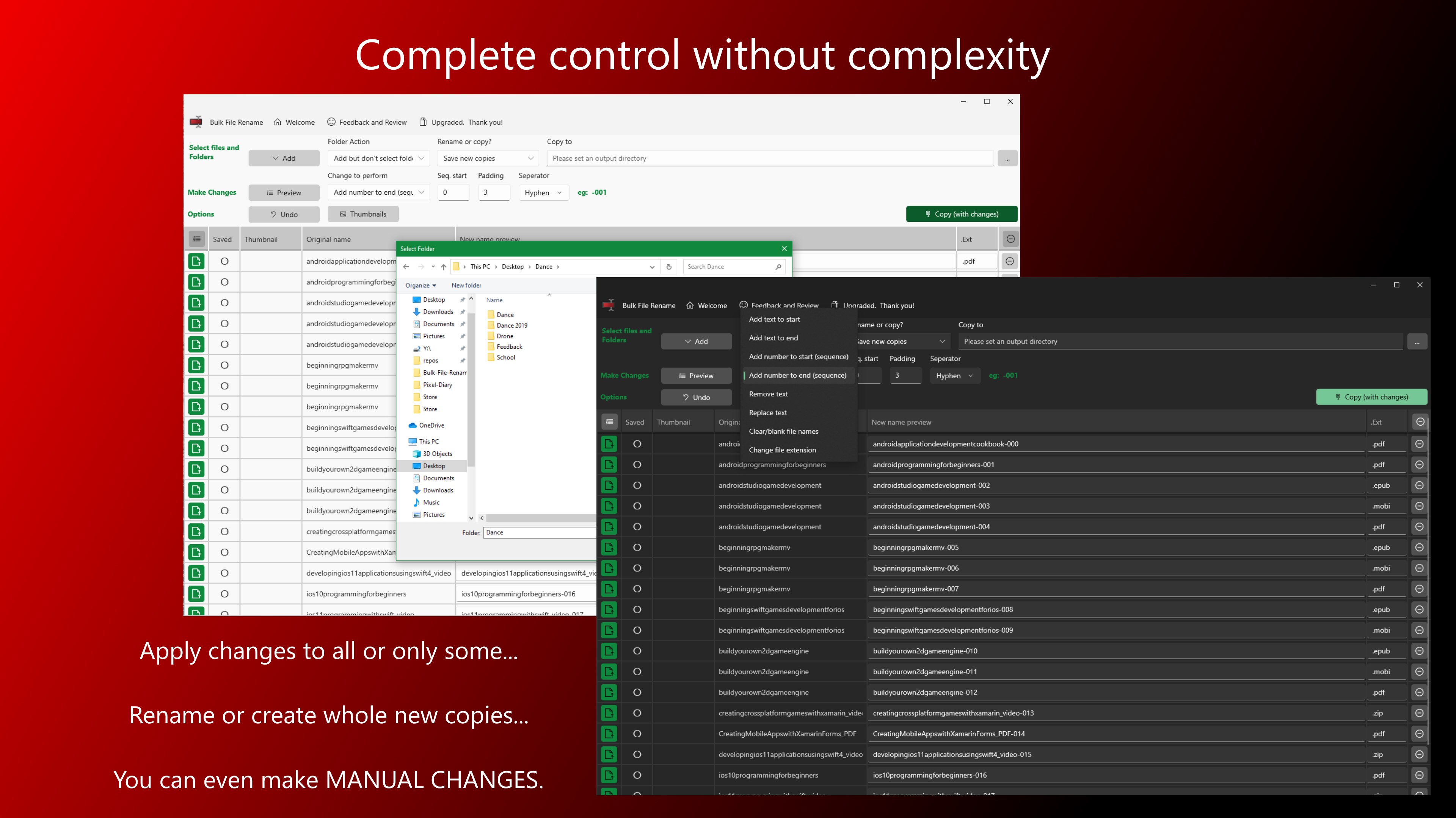 With options including: change extensions, add text, remove text, replace text and more you can do just about anything.