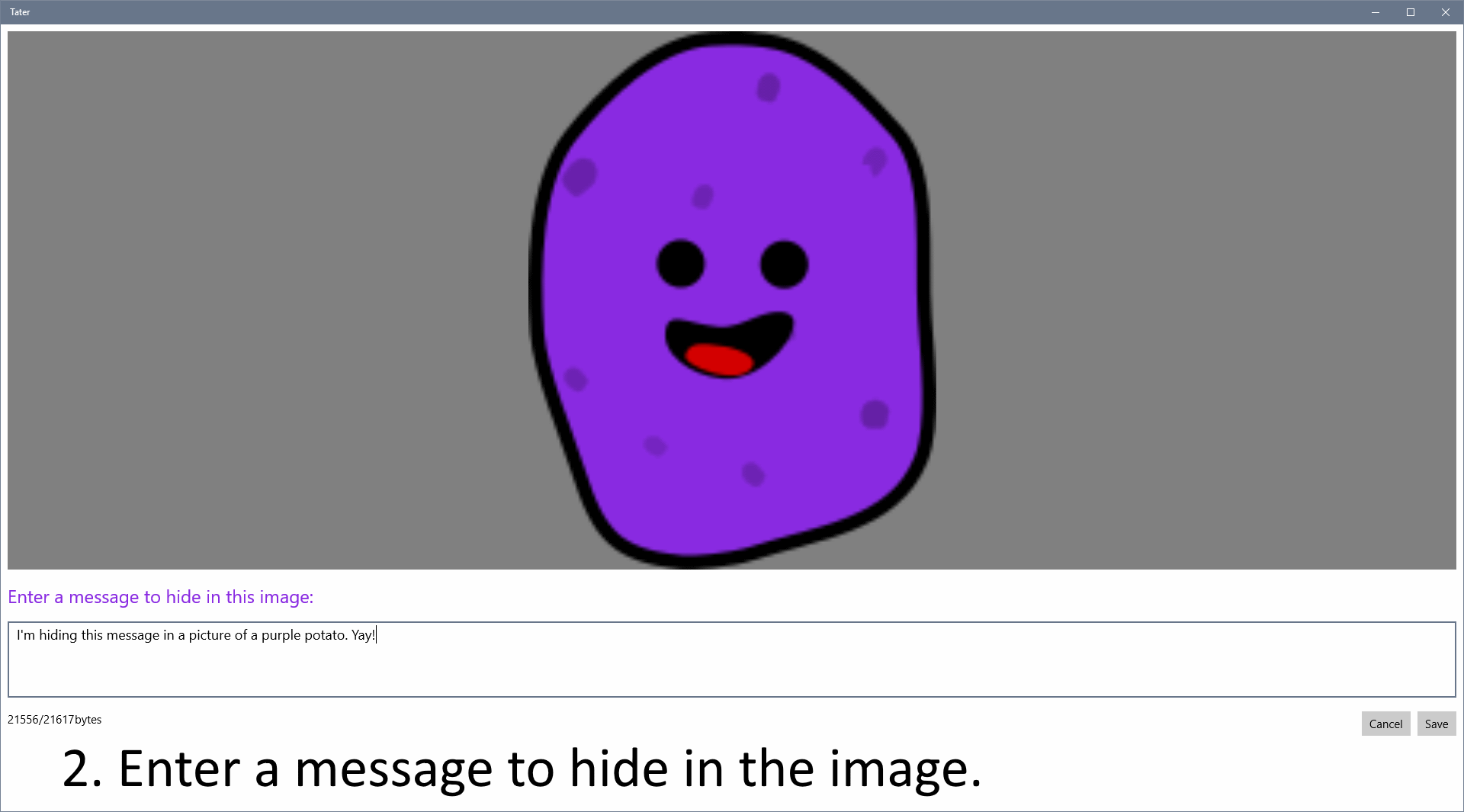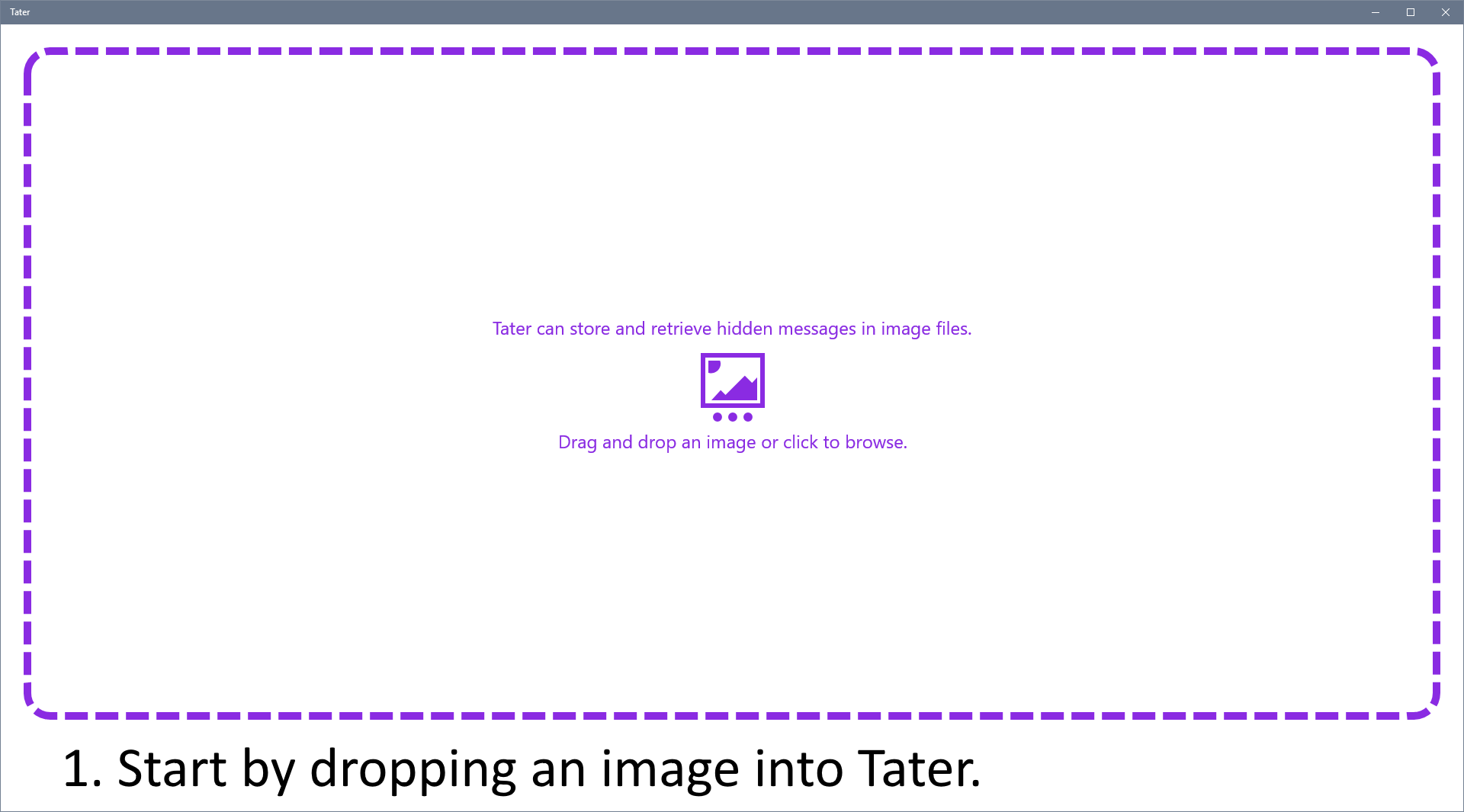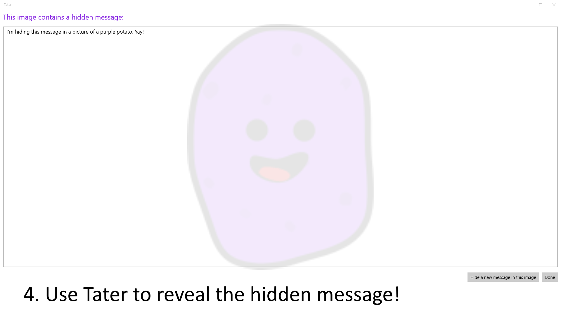 Tater allows you to store and retrieve hidden messages in image files, bringing you one step closer to that childhood dream of being a top secret spy! Drag and drop an image into the app, add your your message, save it to a file, and send it to a friend. All they have to do is drop the image into Tater and your message appears!