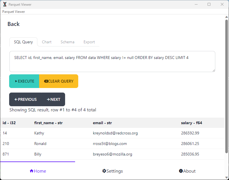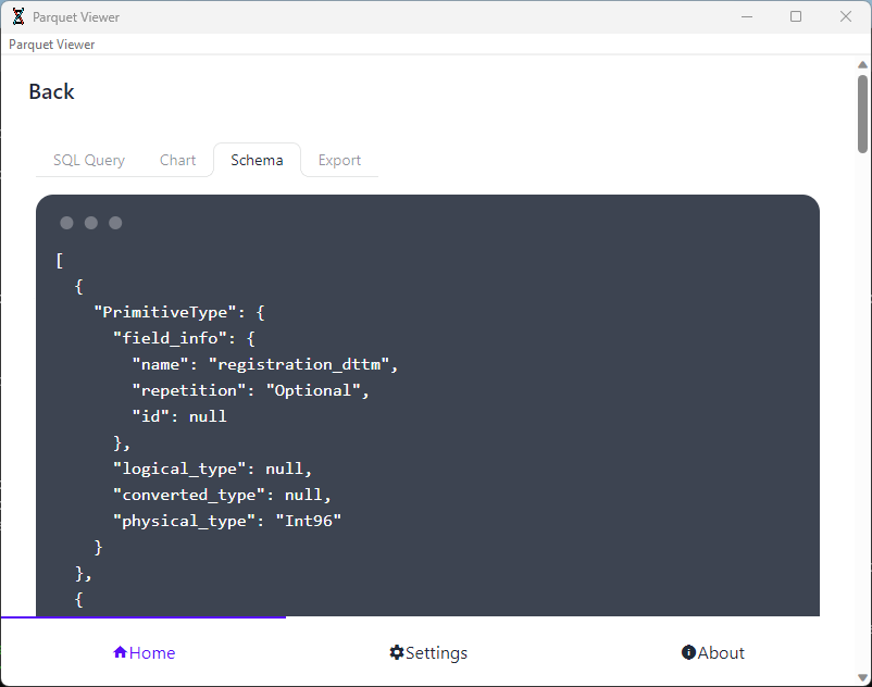 Parquet Viewer is a fast and easy parquet file reader. It lets you read parquet files directly on your PC. Perfect for a quick viewing of your parquet files, no need to fiddle with any programming libraries.