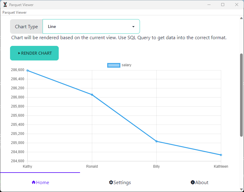 Read Parquet filesQuery using SQLRender charts based on query resultsView Parquet schemaExport to CSV