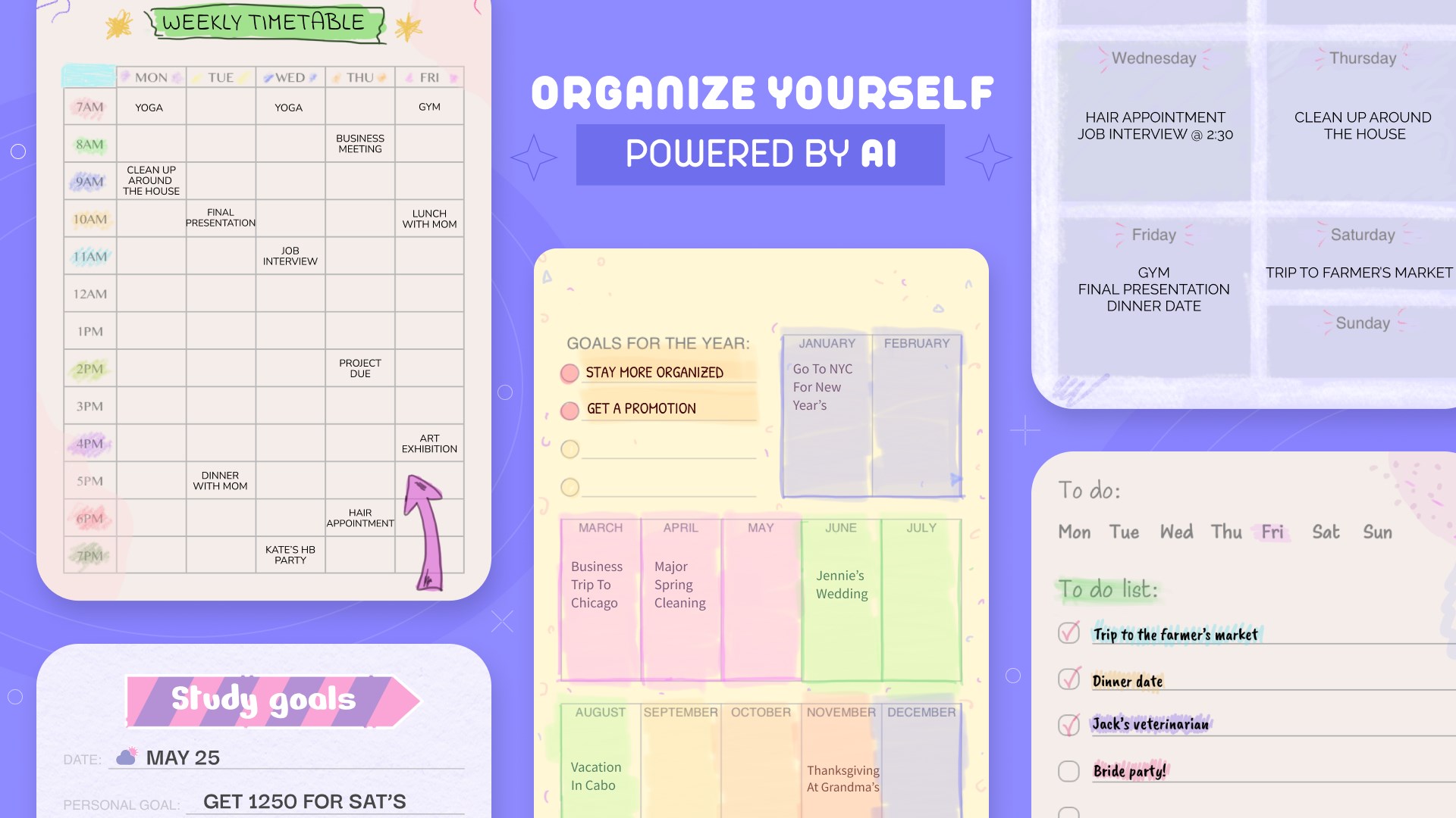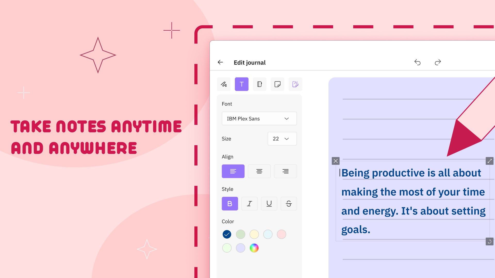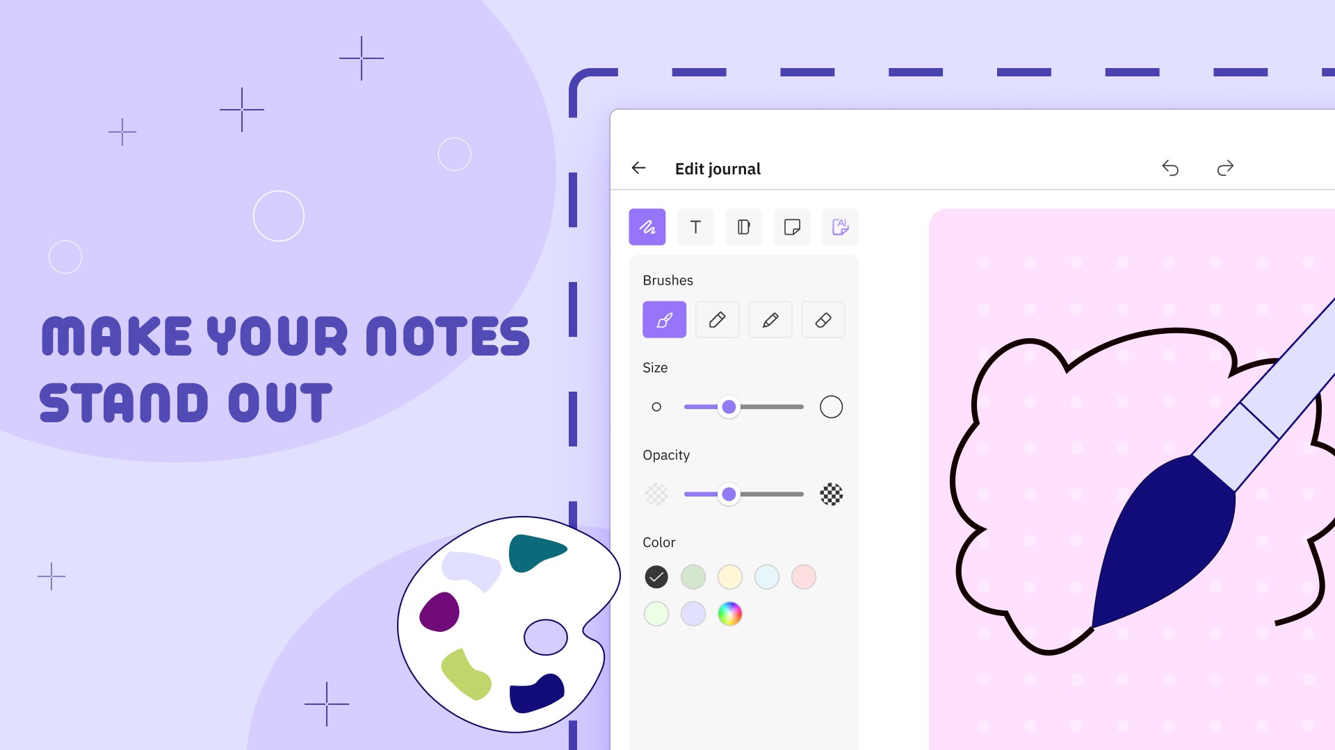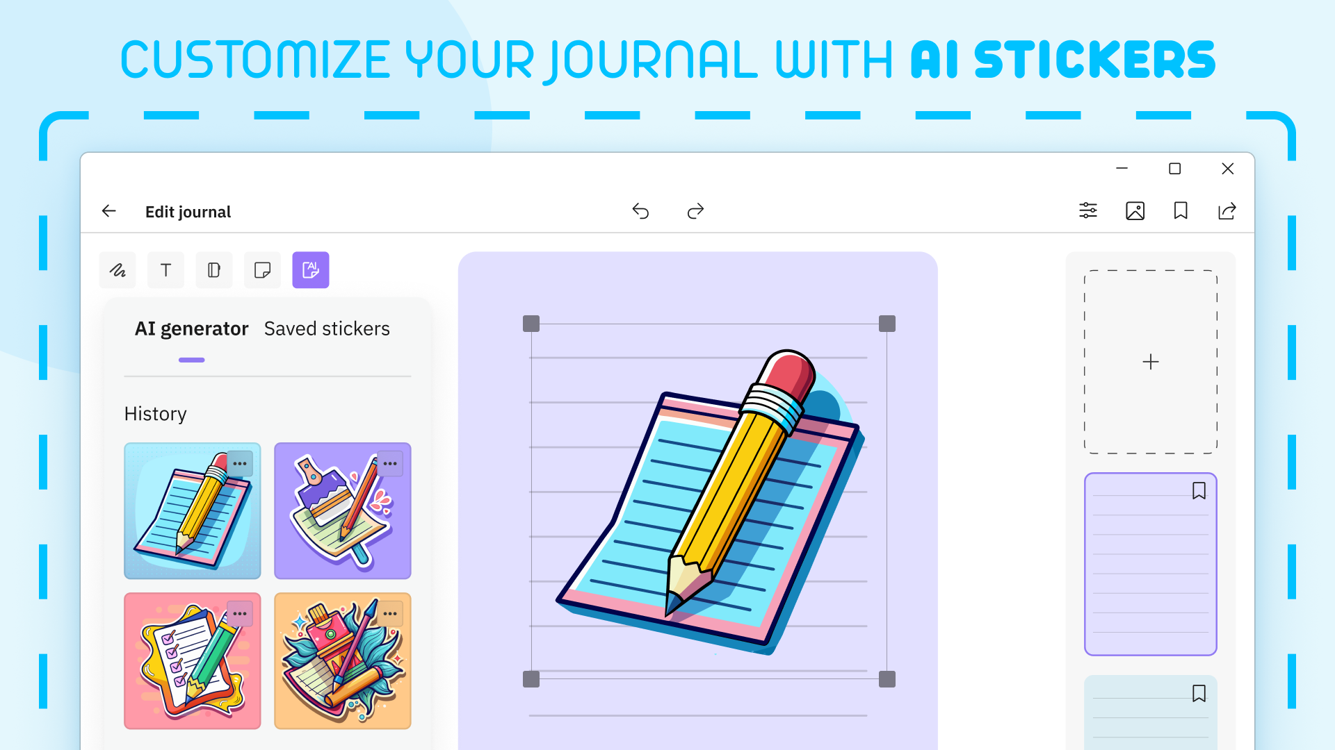 Take creative notes: choose the kind of paper and the color of your pages. Draw, add text, bookmark the most important ideas to make the most of your personalized notepads. Use AI stickers to add individuality to your journal.