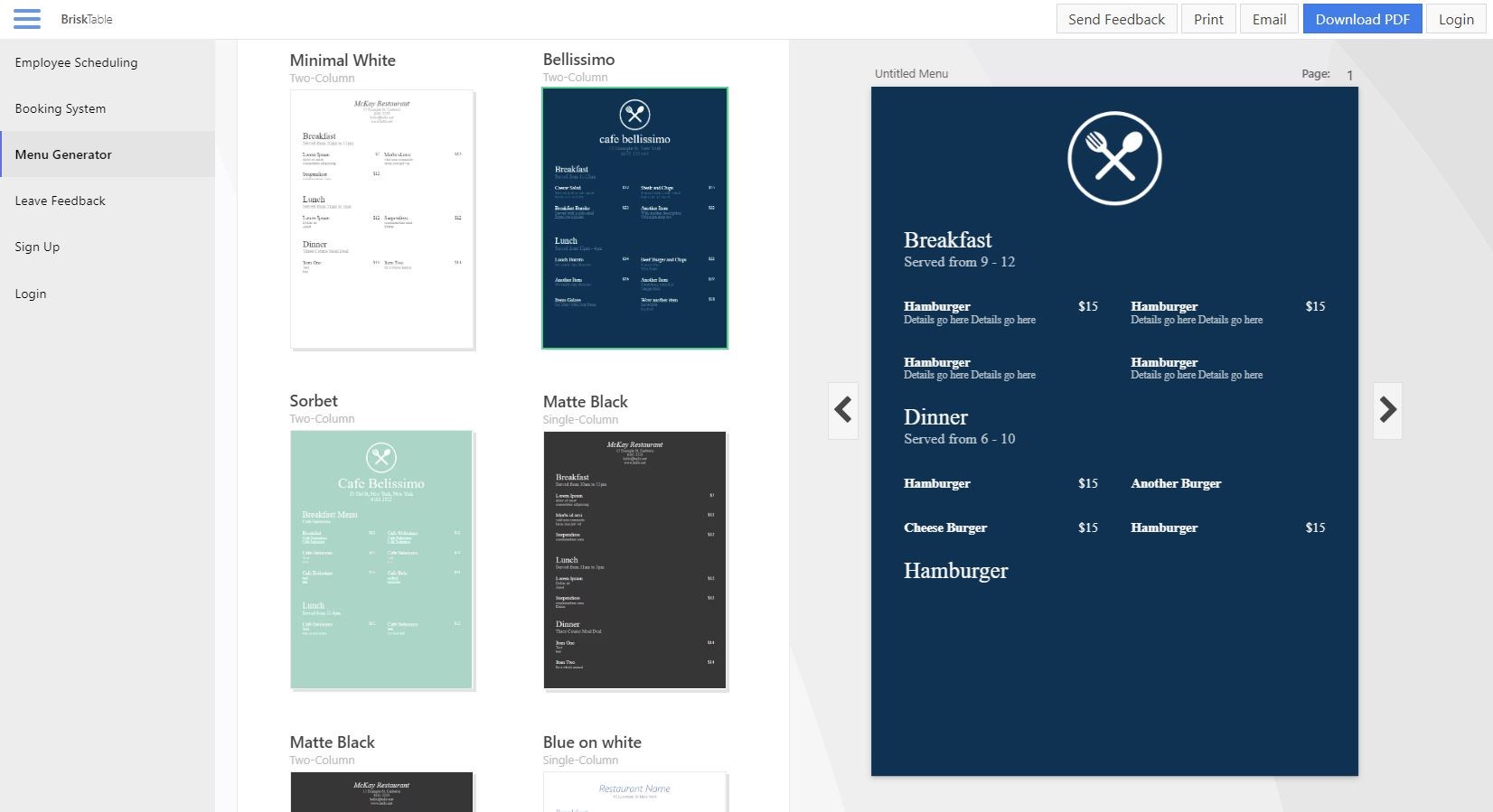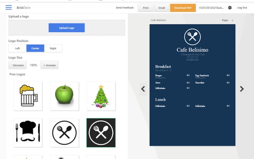 Craft the perfect menu using our intuitive interface20+ professional templates or start from scratchCustomize your fonts, sizes and marginsUpload your own logo to highlight your brandPrint in all popular paper sizesEasily create and save your food & drink optionsAdd descriptions, notes and optional extrasSpecify vegetarian, vegan and gluten-free optionsCustomize menus for dine-in, takeout and deliveryPerfect for wine lists, daily specials, drink menus, seasonal menus and moreOpen existing menus to make changes and adjust your pricing on the flySave as a PDF to share onlineNo design experience necessary