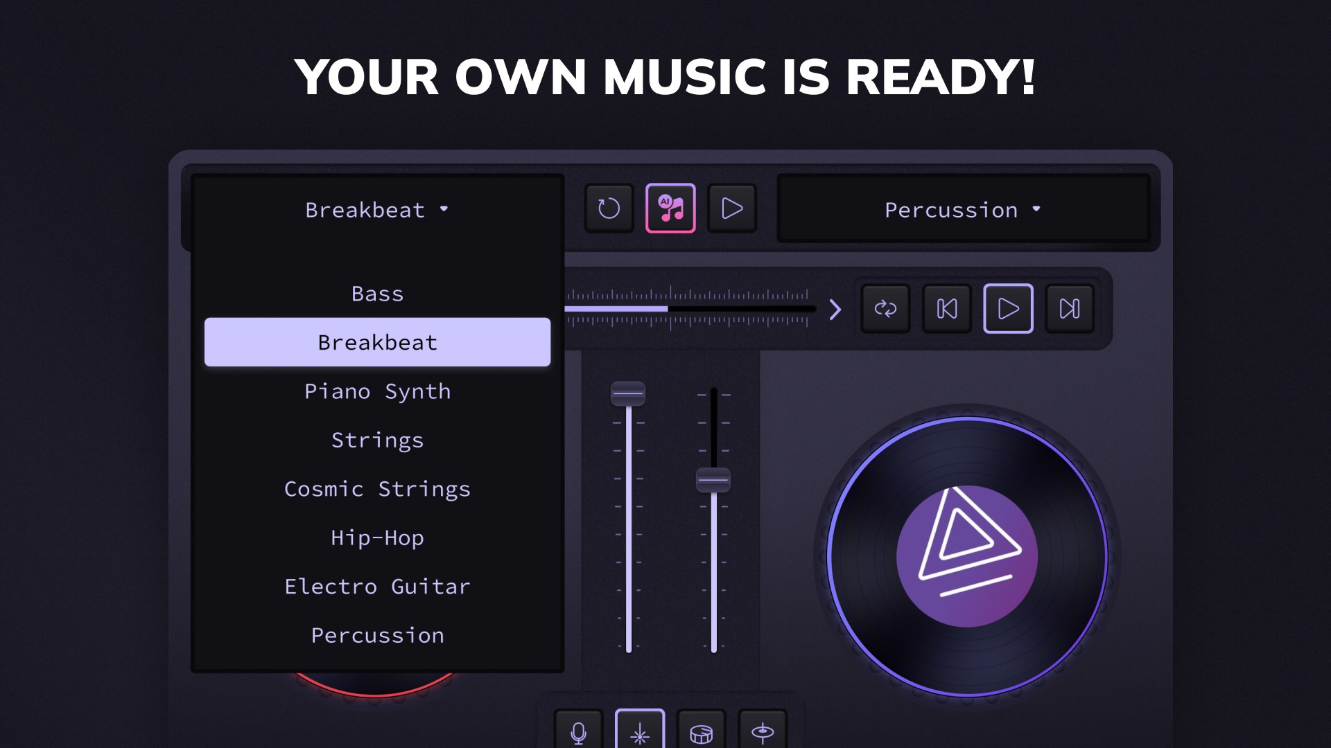Create your own melodies or play the demo recordings; or mix them into your new set. To help you make your own track there are some instrumental presets - add separate tracks for guitar, bass, strings, percussions and other. Find out more extra features for yourself!