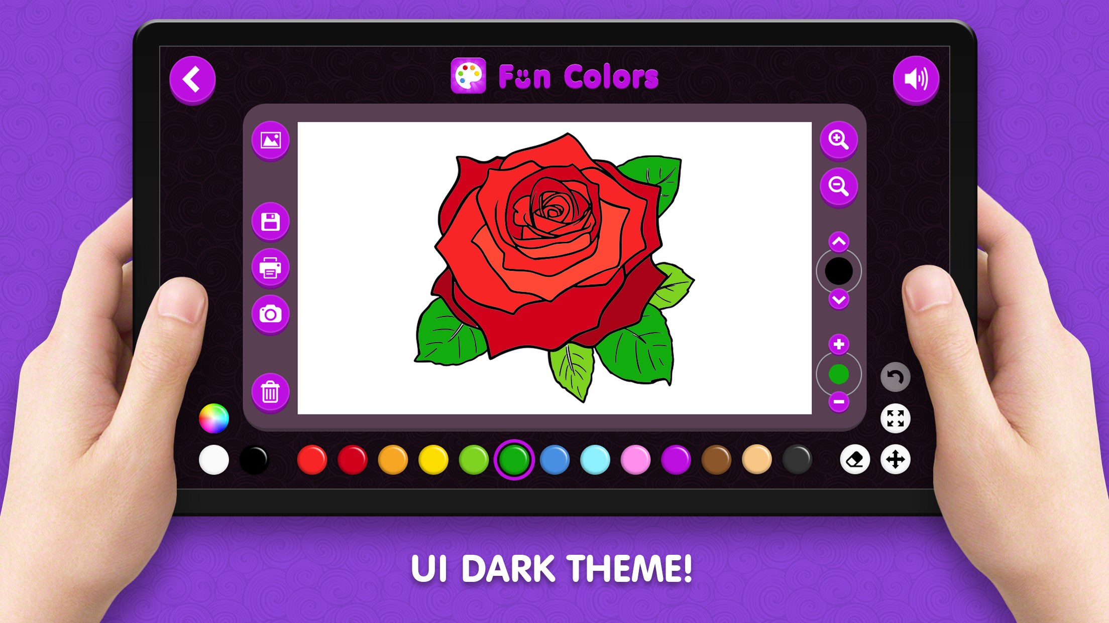 Uploading your own coloring pagesDark theme for protection of eyesMode for drawing and coloringColoring pages of different categoriesUploading images or photos to the gamePrinting drawings from the gameSaving drawings to the deviceAdjust the size and type of paint brushZoom in / out of the canvasUndo the last actionIntuitive controls for kids