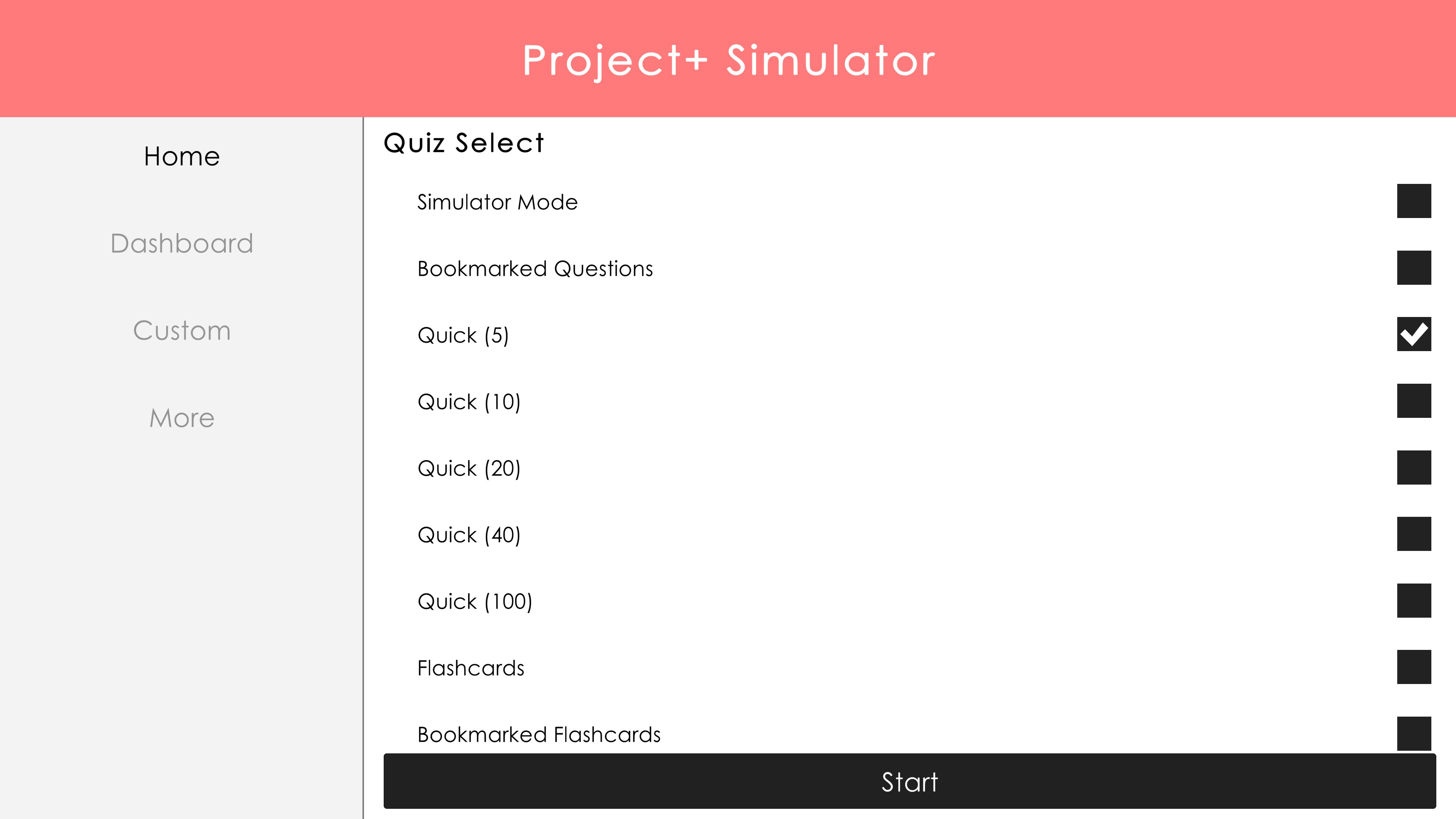 Allows you to quickly start a 5, 10, 20, 40, 50 question exam with randomized questions.