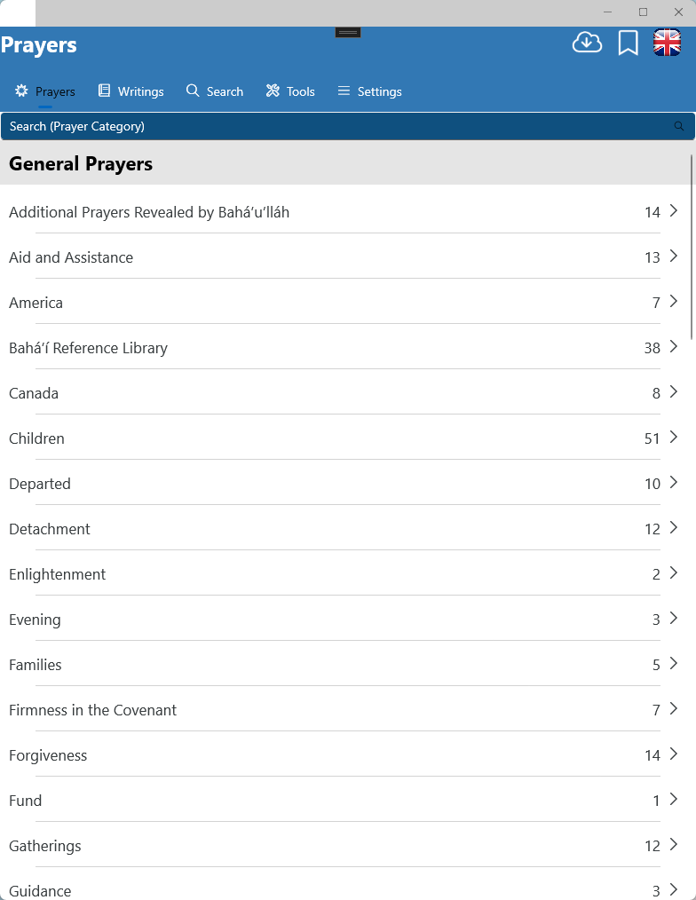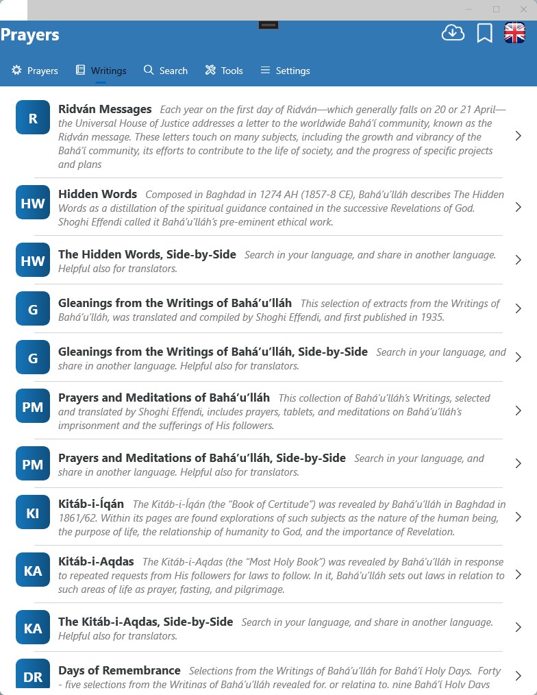 106 languages, hundreds of categories, and thousands of Baha'i Prayers & Writings complemented by a wide assortment of tools and features.