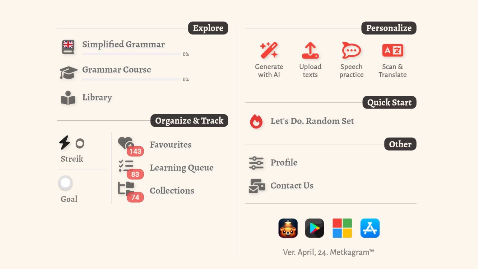 Unique method of Language LearningLibrary of ready Collections with Grammar CardsAdd Your Own Annotated grammar cards with Metkagram AI Repeat cards and grammar in ContextSimplified Grammar