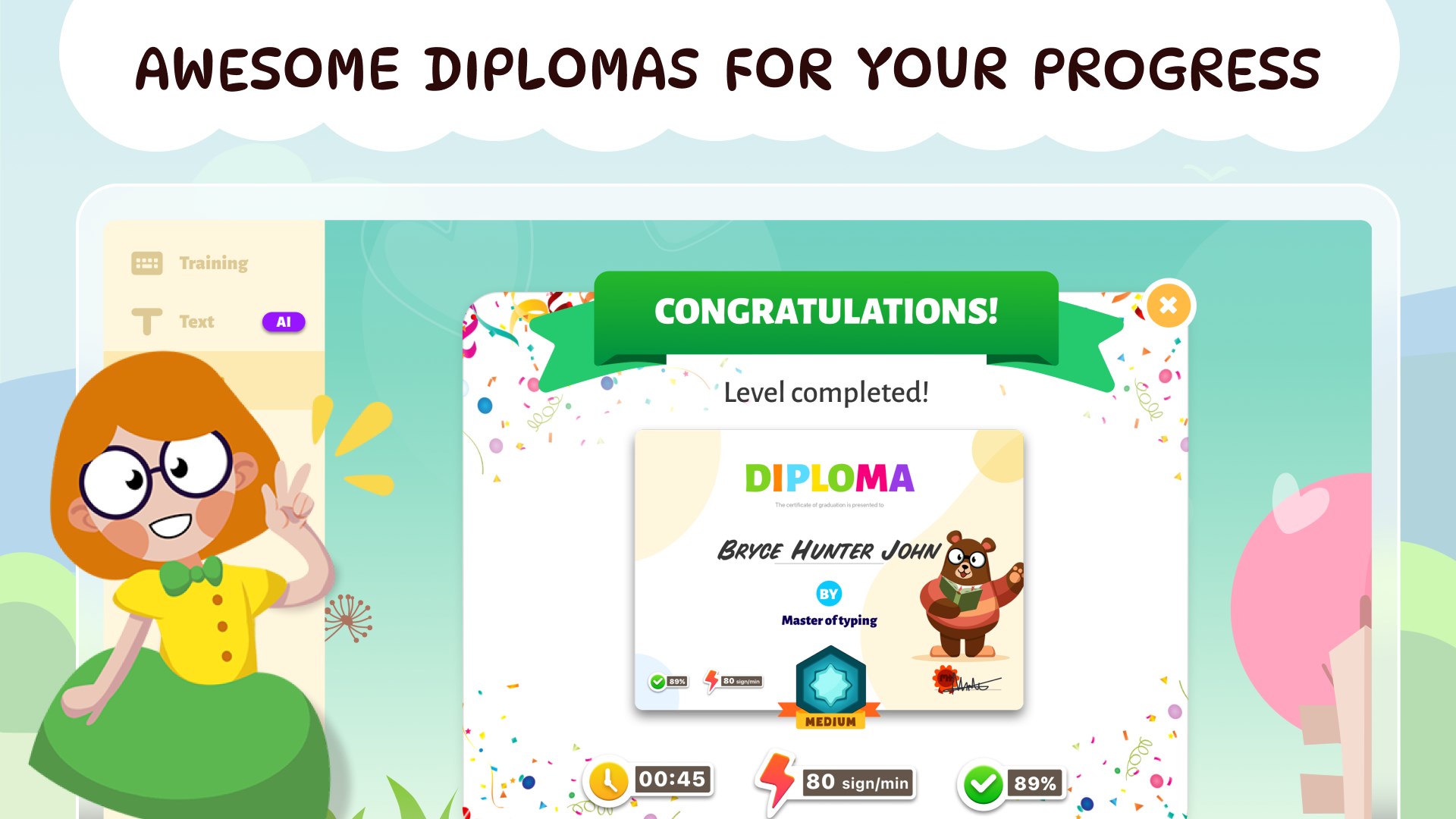 To evaluate the progress of budding typists, the app provides exams that test speed and accuracy. Successfully completing these exams earns them certificates that attest to their hard work and serve as a proud symbol of their achievements.