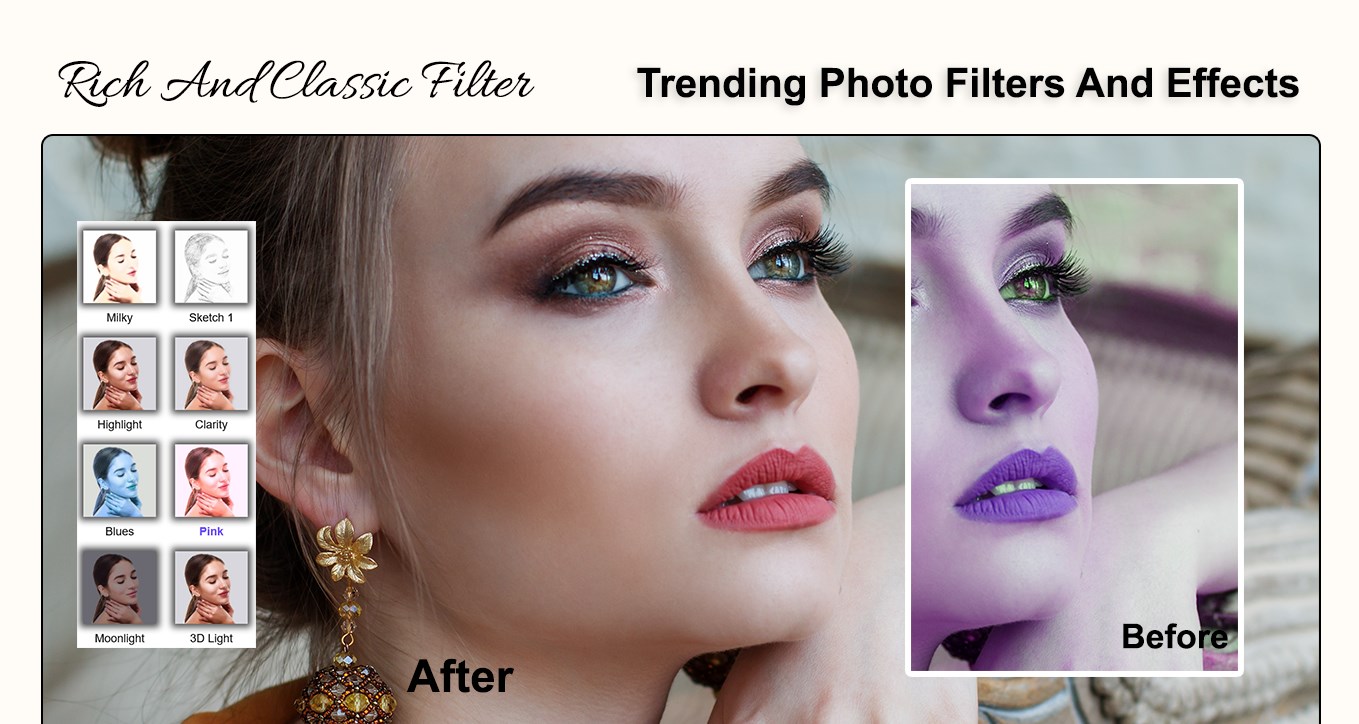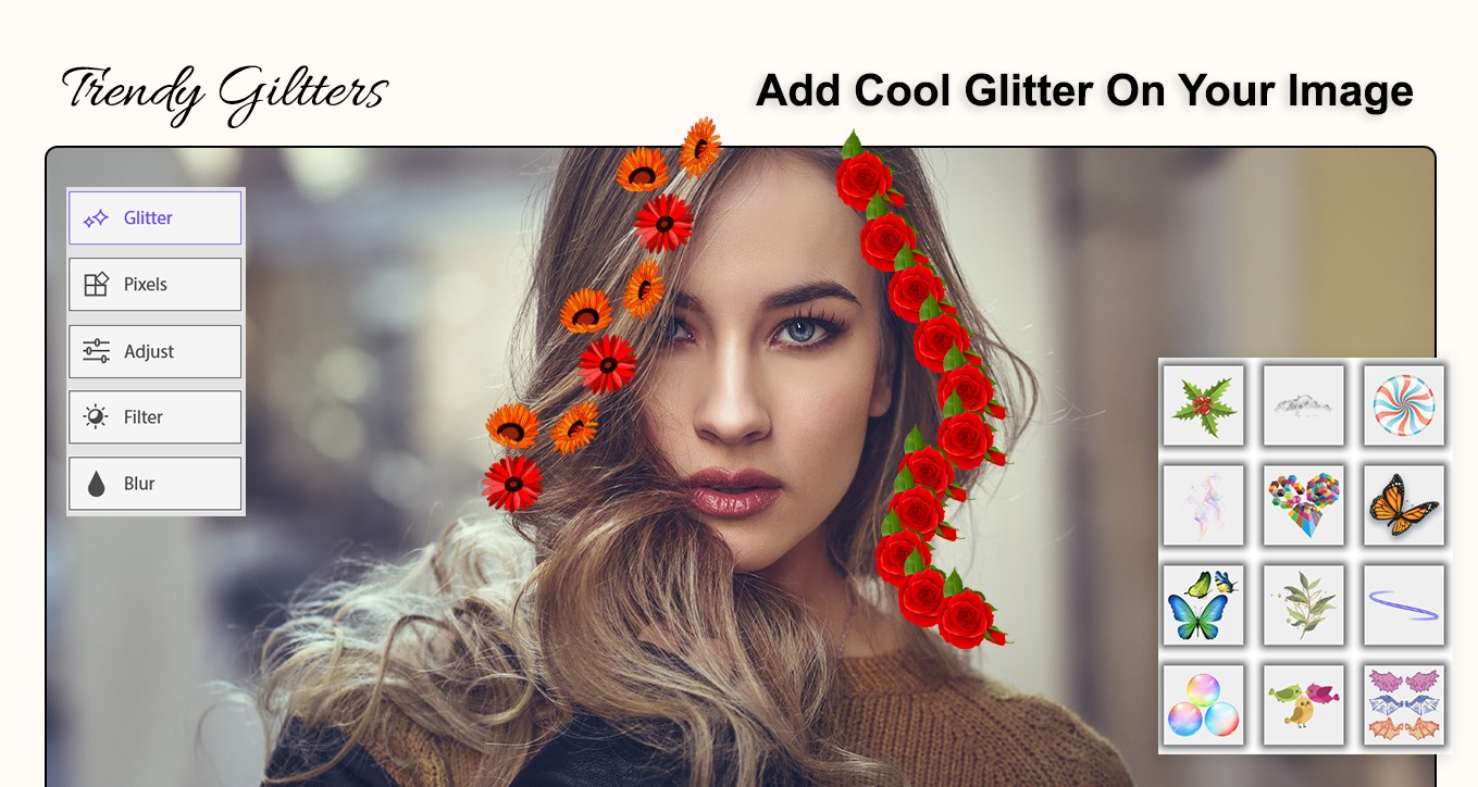 Glitter effect use free-hand drawing to create sparkling stars on picture. Extra-ordinary photo editor with a unique combination of glitter and pixel effects to transform photo completely.