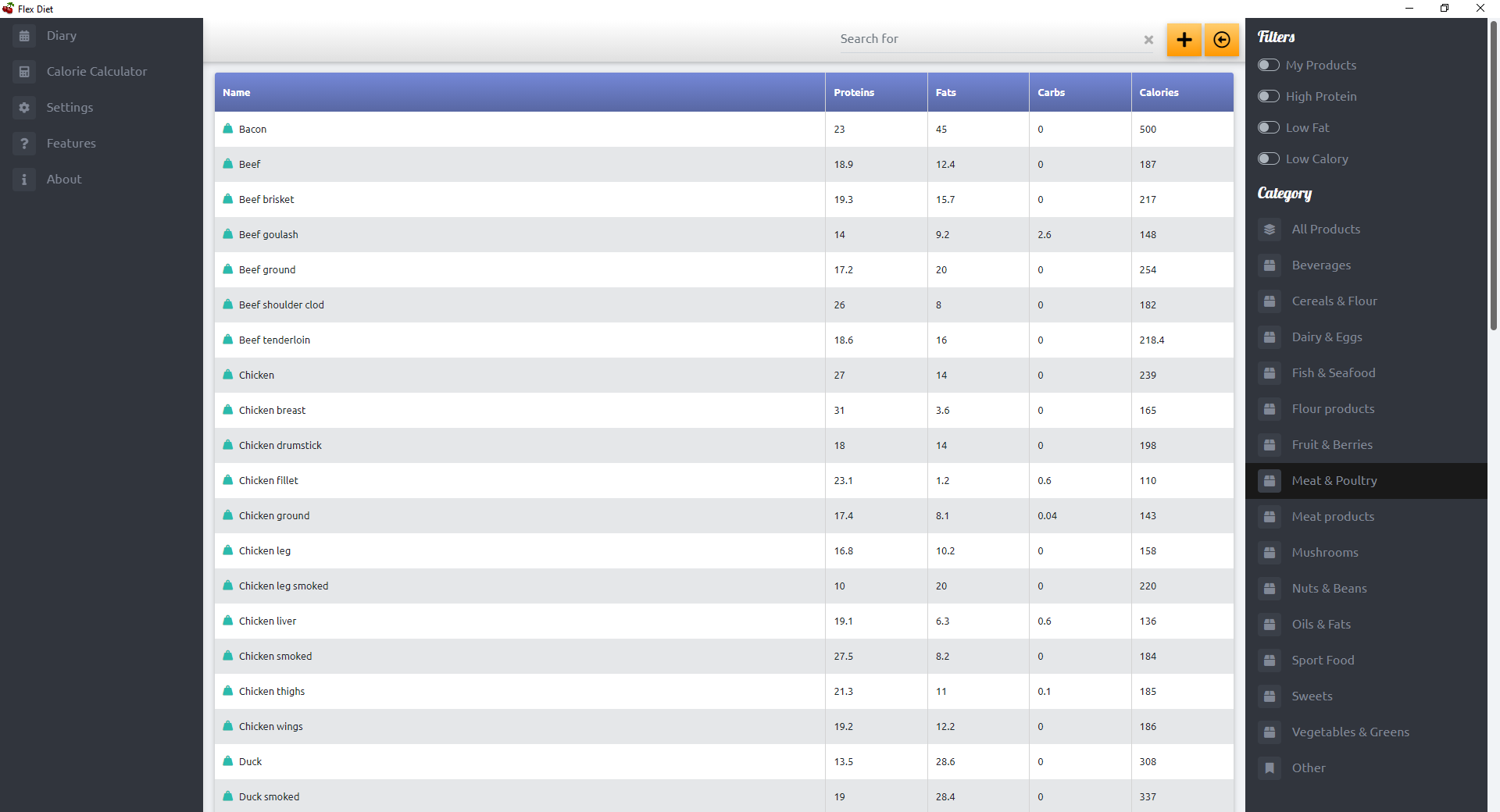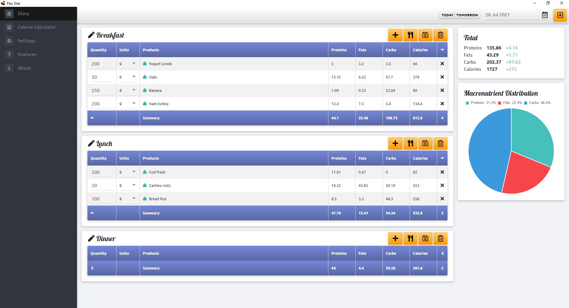 If you are actively participate in sports, follow a healthy diet, keep fit or simply lead a healthy lifestyle, then for the best results, you just need to control your own diet every day (both food quality and total calories in food). This app makes this task easy.
