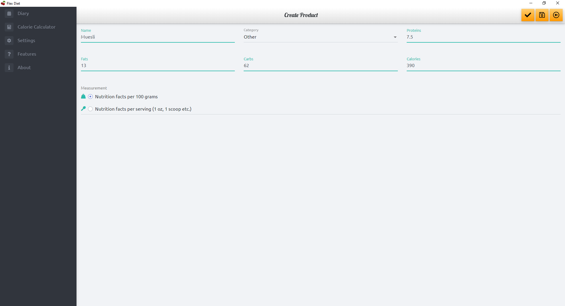 Convenient user interface for creating dishes and meals.Local base of products with convenient search filters.Saving history, own dishes and adding new products.Ability to work offline.No need to enter any personal information.