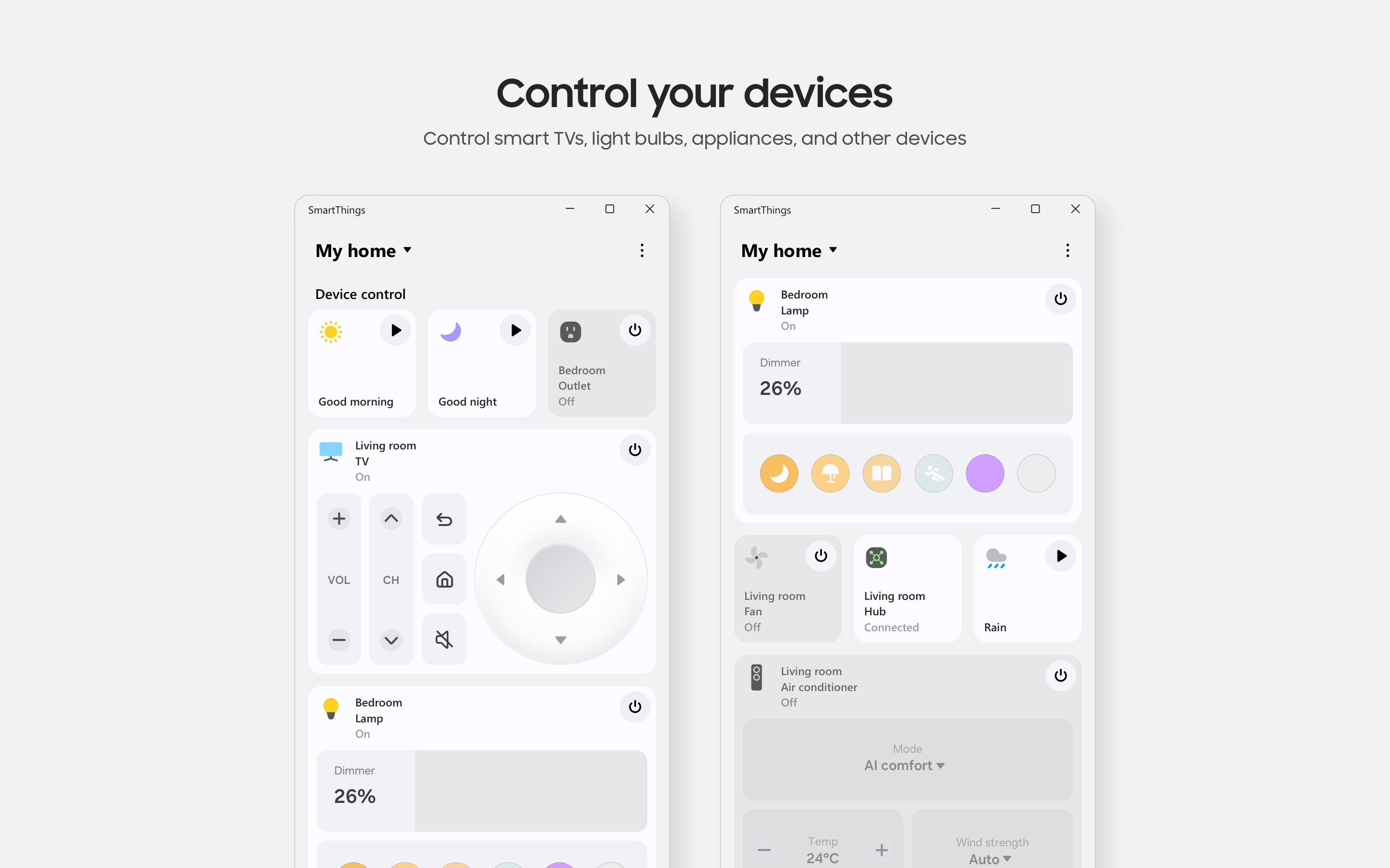 Use your Samsung Smart TV, home appliances, and SmartThings-compatible devices more conveniently with one app.