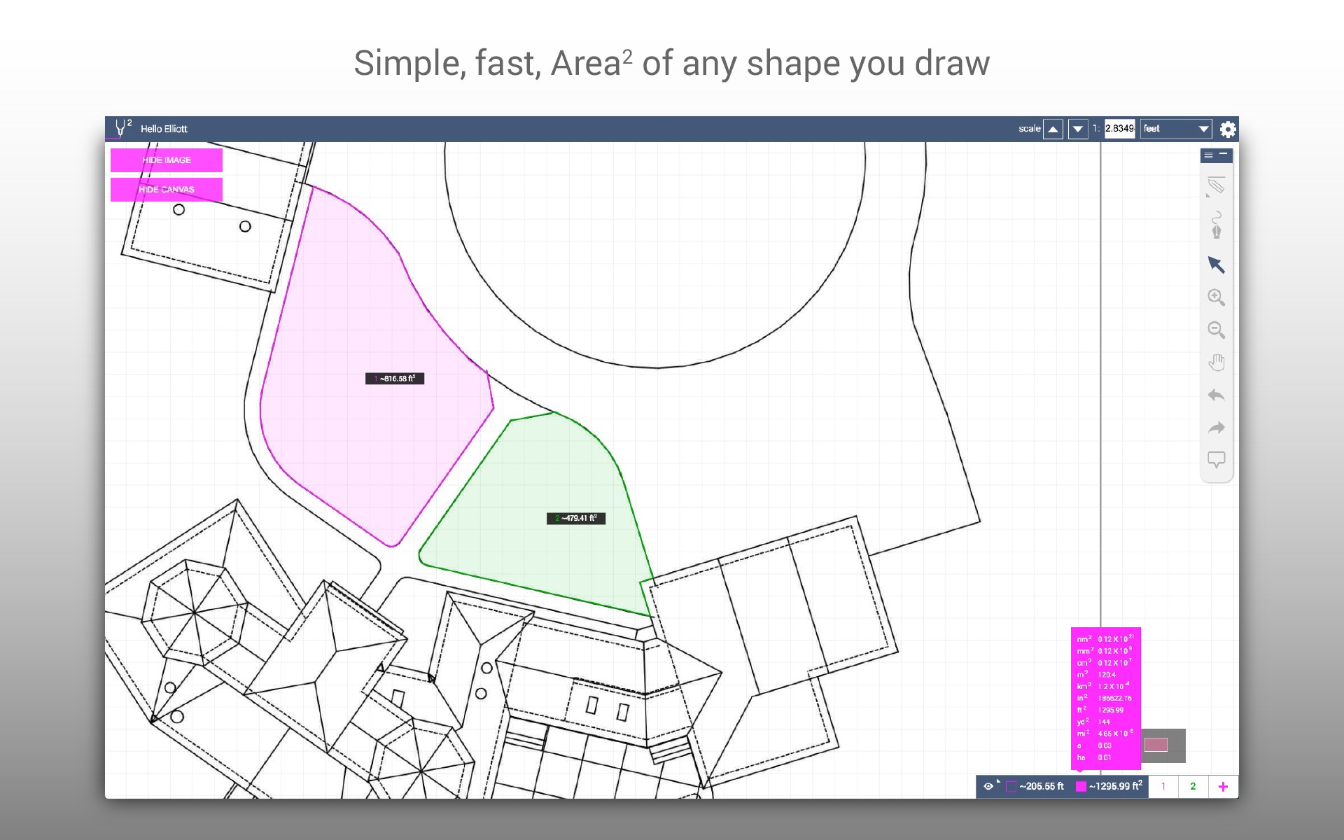 SketchAndCalc™ is the only area calculator capable of calculating areas of uploaded images. The area calculator has a unique feature that allows you to set the drawing scale of any image before drawing the perimeter of the shape. Irregular area’s containing angles or curves are therefore easily calculated without complex geometry math.