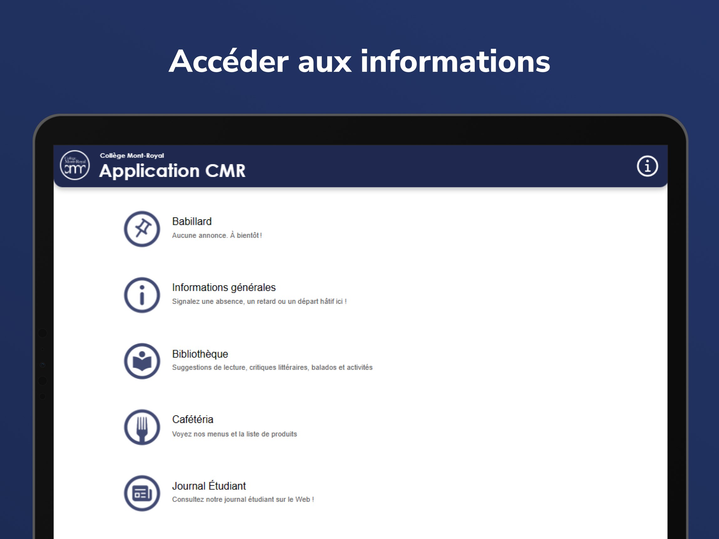 Accédez aux informations pratiques du Collège Mont-Royal avec notre application CMR !