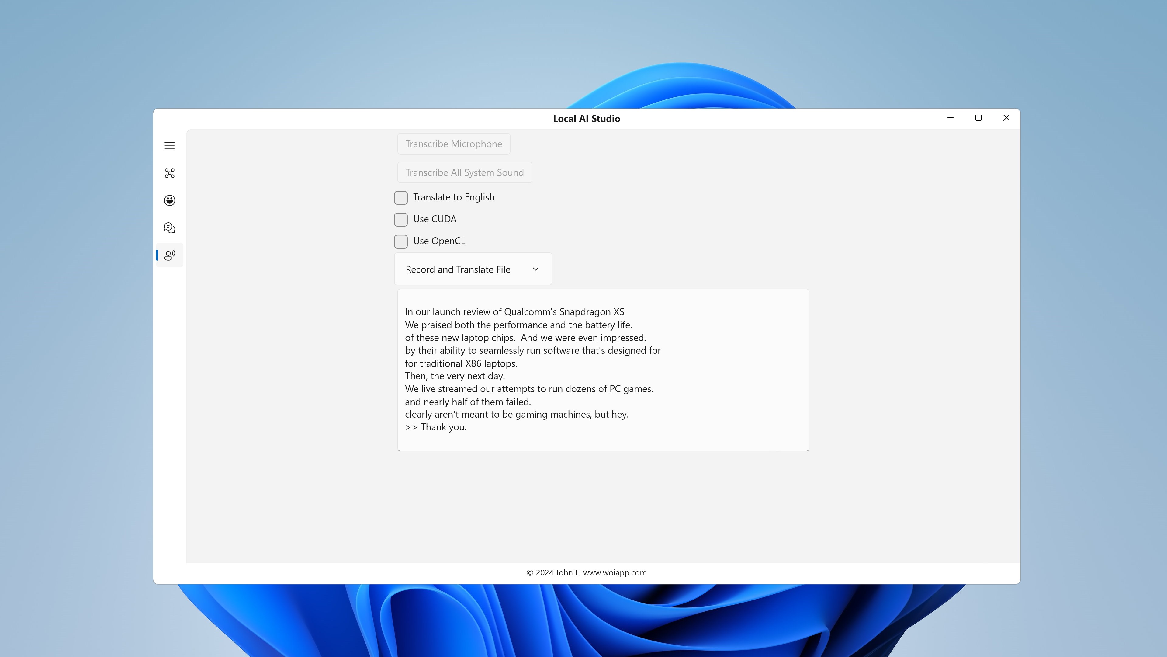 - Automatic Speech Recognition (ASR) with Whisper model: Convert spoken words and windows system audio into text