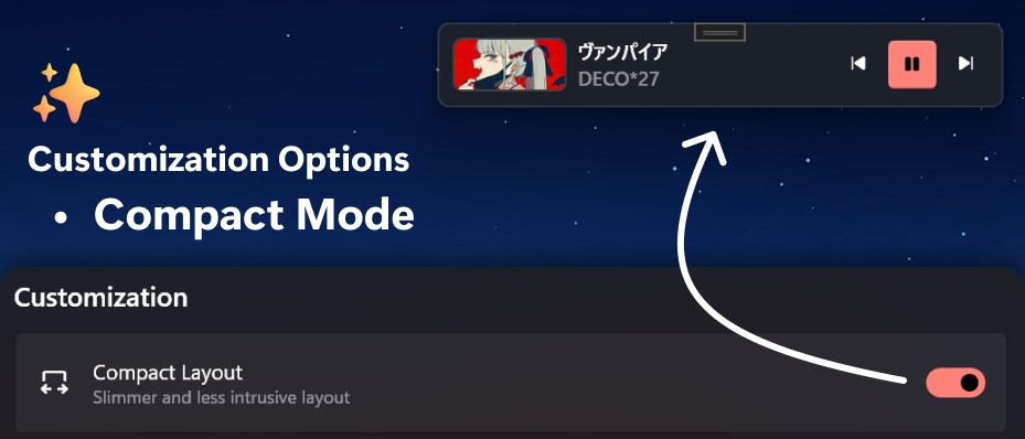 The UI seemingly blends in with Windows 10/11, providing you an uninterrupted, clean, and native-like experience when controlling your media. Featuring smooth animations, light and dark modes, customizable positions, and more.