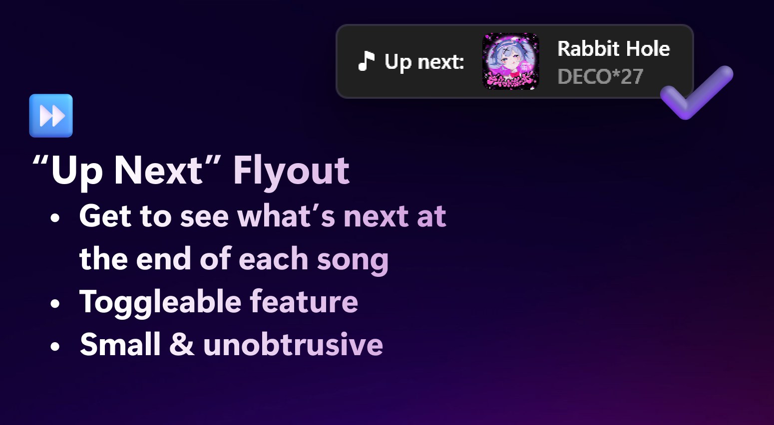 - (NEW) Next Up flyout: displays what\'s next after the end of each song