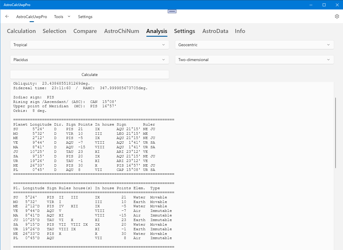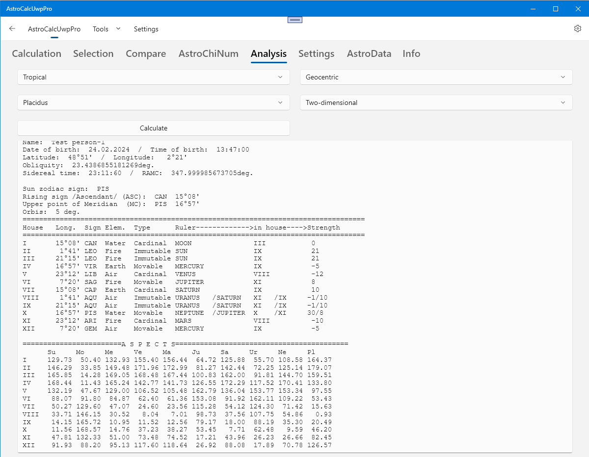 - Analysis of one single horoscope or compare of two selected horoscopes