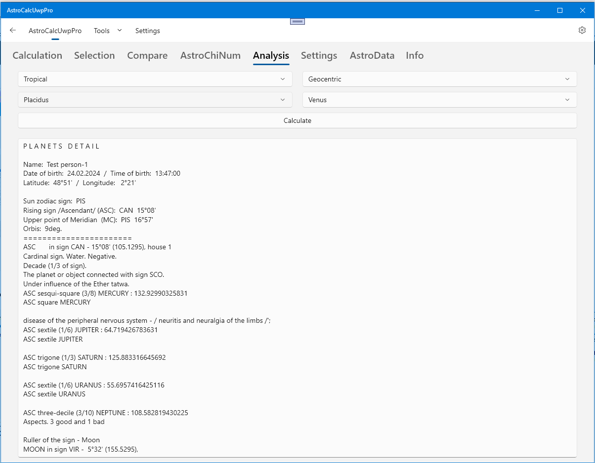 - Planets detail analysis. All planets / All aspects / Different house systems
