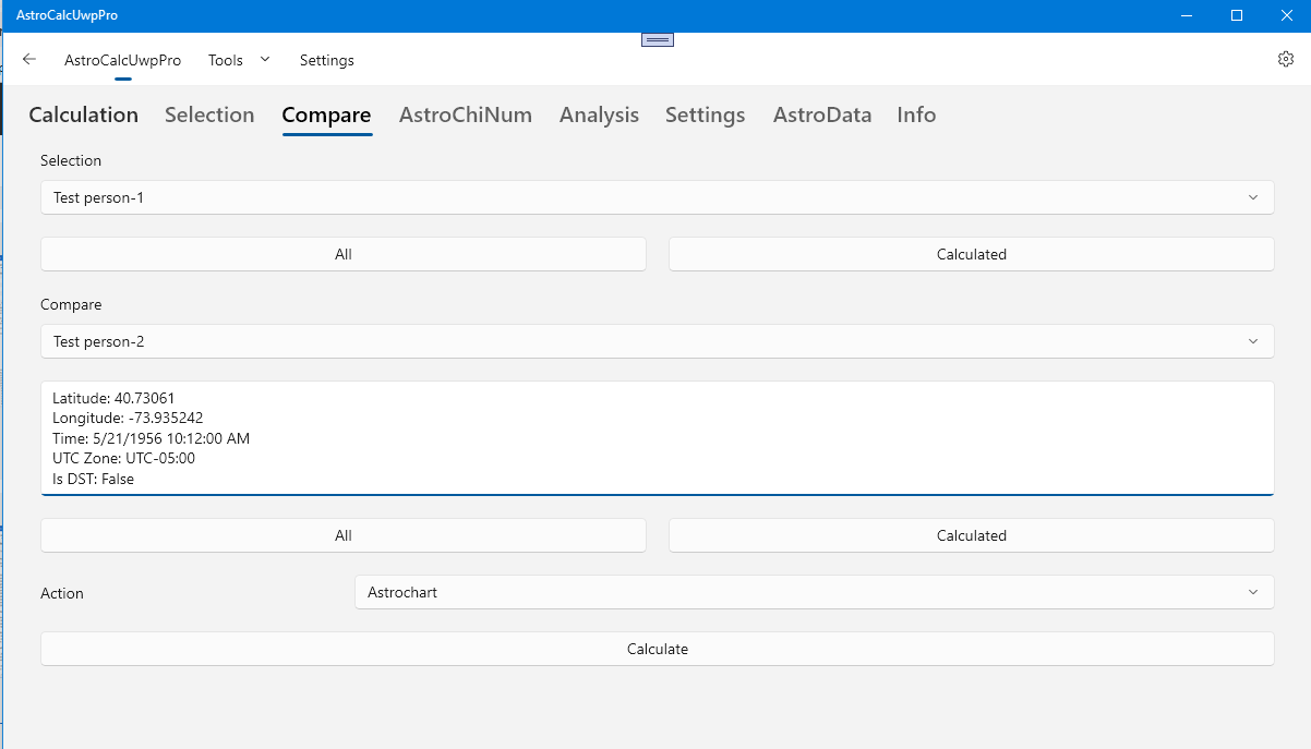 - Option to compare two selected horoscopes – with astrocard compare mode, planets, and houses detail and compact analysis as of compare of their biorhythms to each other
