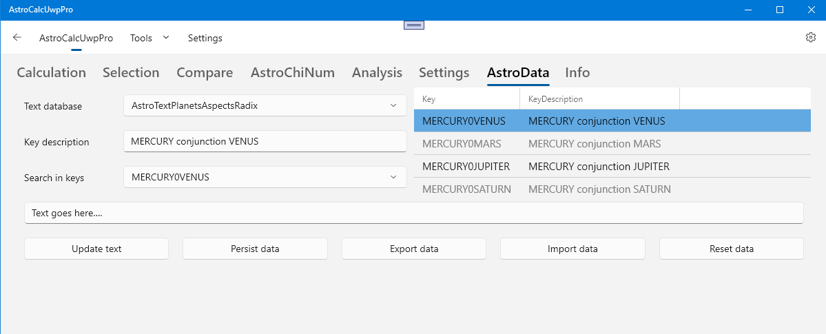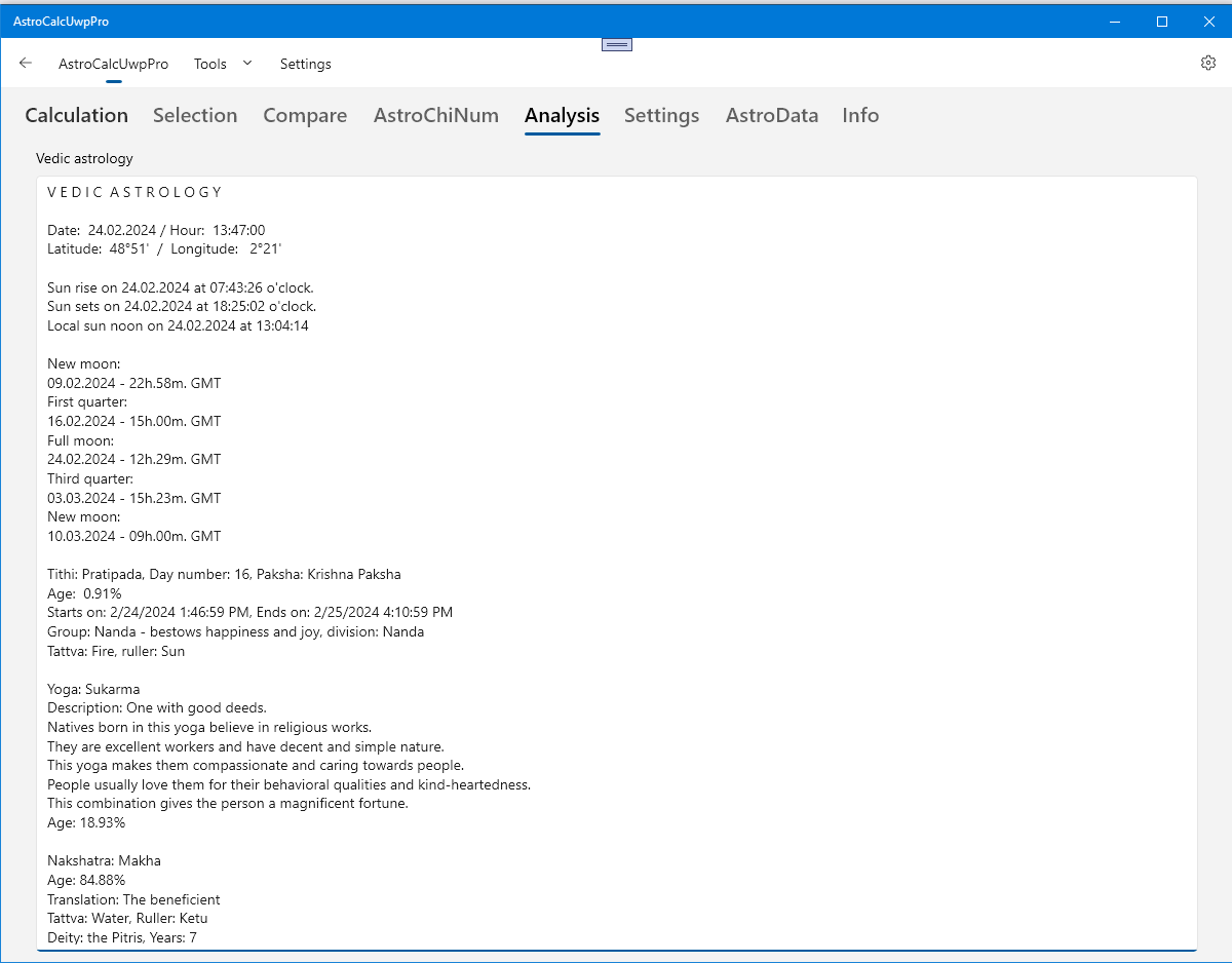 horoscope calculations (geocentric, heliocentric)tropical and sidereal zodiacprecise planets positions (elliptical, heliocentric, equatorial, horisontal foltered by selected planet or point) astrological house calculation (including Placidus house system)astrological aspects – filtered by typeset astrology text for aspects, signs and house positions - manully edit, persist, export, importcompare horoscopes add, update, delete horoscopesprimary directions / mundane directions / zodiac directionstransistions (planetary directions) to selected horoscope solar / moon revolutionssecondary directions / progressionscalculate conception horoscopesolar / moon eclipses / planets rise / set biorithm calculations - physical, emotional and mental cycles, calculation starting biological year moon calendar with text description for every dayi-ching astrology - year, week and day calculations (hexagrams, trigrams)vedic astrology - Tithis, yogas, nakshatras, tatwas...i-ching numerology, early and later heaven tigram Get on Amazon as android app: https://www.amazon.com/gp/product/B0DHNTMWC1