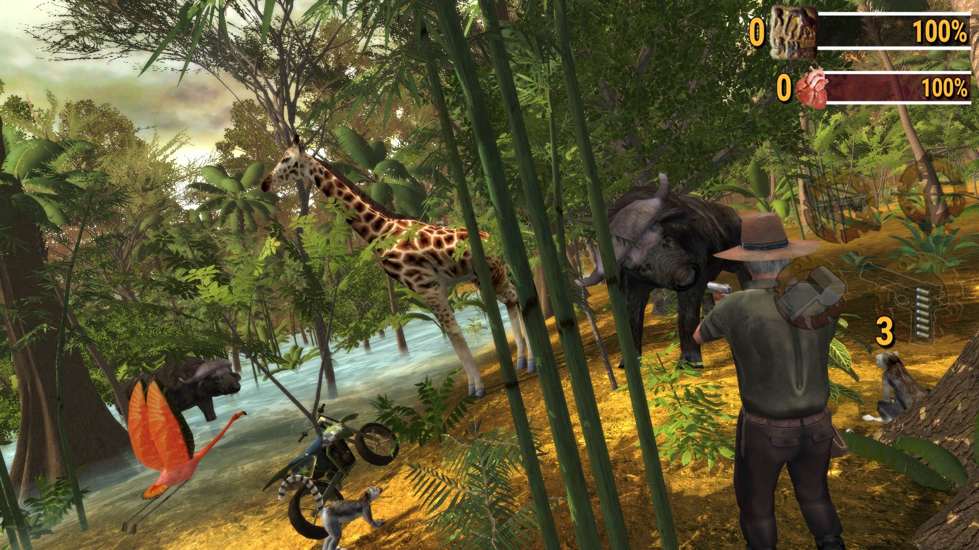 Safari: Evolution has High quality graphics and gameplay, hunt by foot, 4x4 Off-Road Vehicle, Motorbike, Boat or Horse - your faithful friend - Whistle to Call.