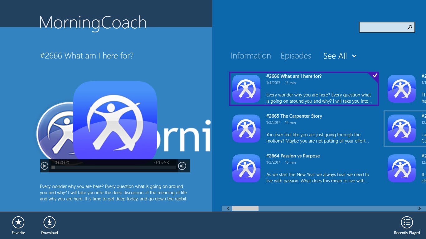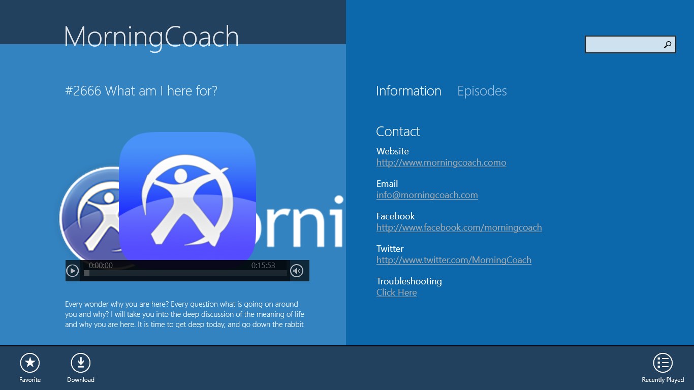 This is the most convenient and reliable way to access MorningCoach. You're always connected to the latest episode. Instant access, just touch and play! MorningCoach app contains the following features: Streaming access to play episodes from anywhere, always updated with the latest episodes- and an archived back catalog, download the episodes and play them when offline, favorites (mark the episodes you want to return back to over and over), contact the show, and more! With great features like these, if you are a fan of the show, you won't want to be without this app.