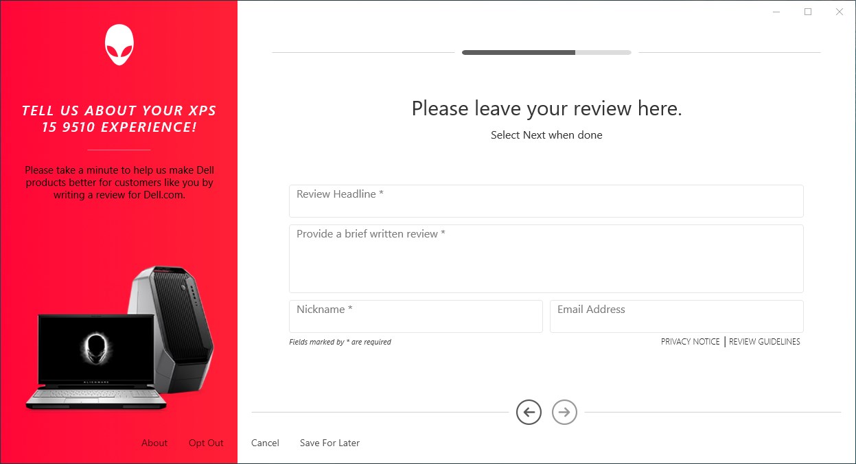 Alienware Customer Connect is an easy to use application built by Dell to provide a pipeline for real-time feedback from customers. This application prompts users to provide a rating and review for their product.