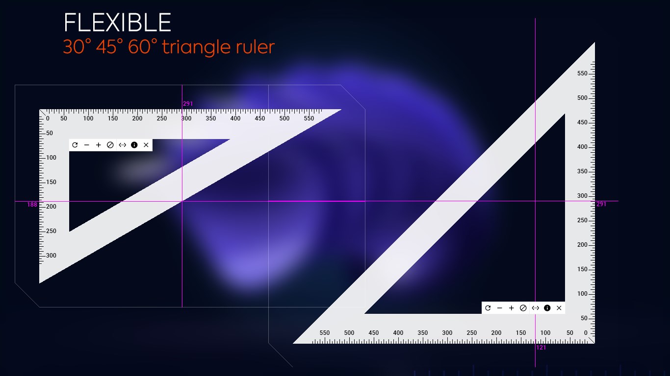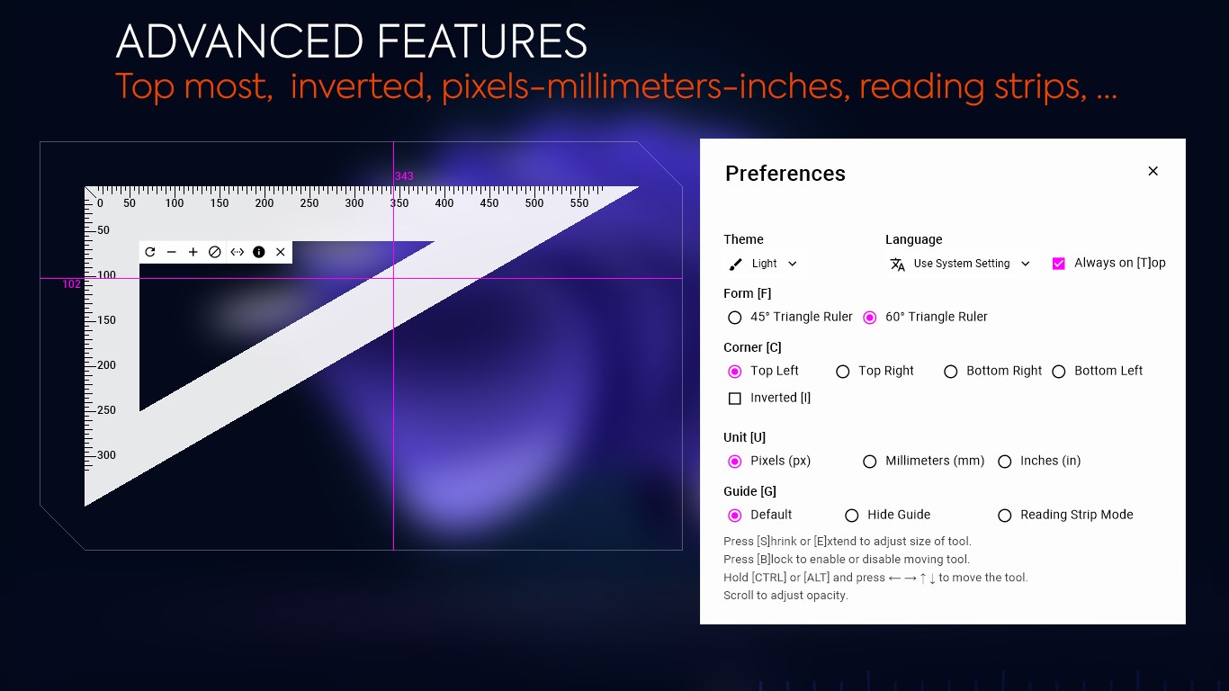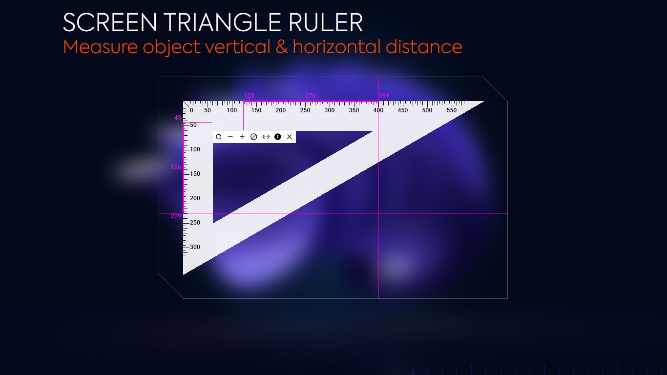 On screen triangle ruler measuring the distance of objects on the screen in Pixels, Inches, True-size Millimeter.Measure both vertically and horizontally at the same time.