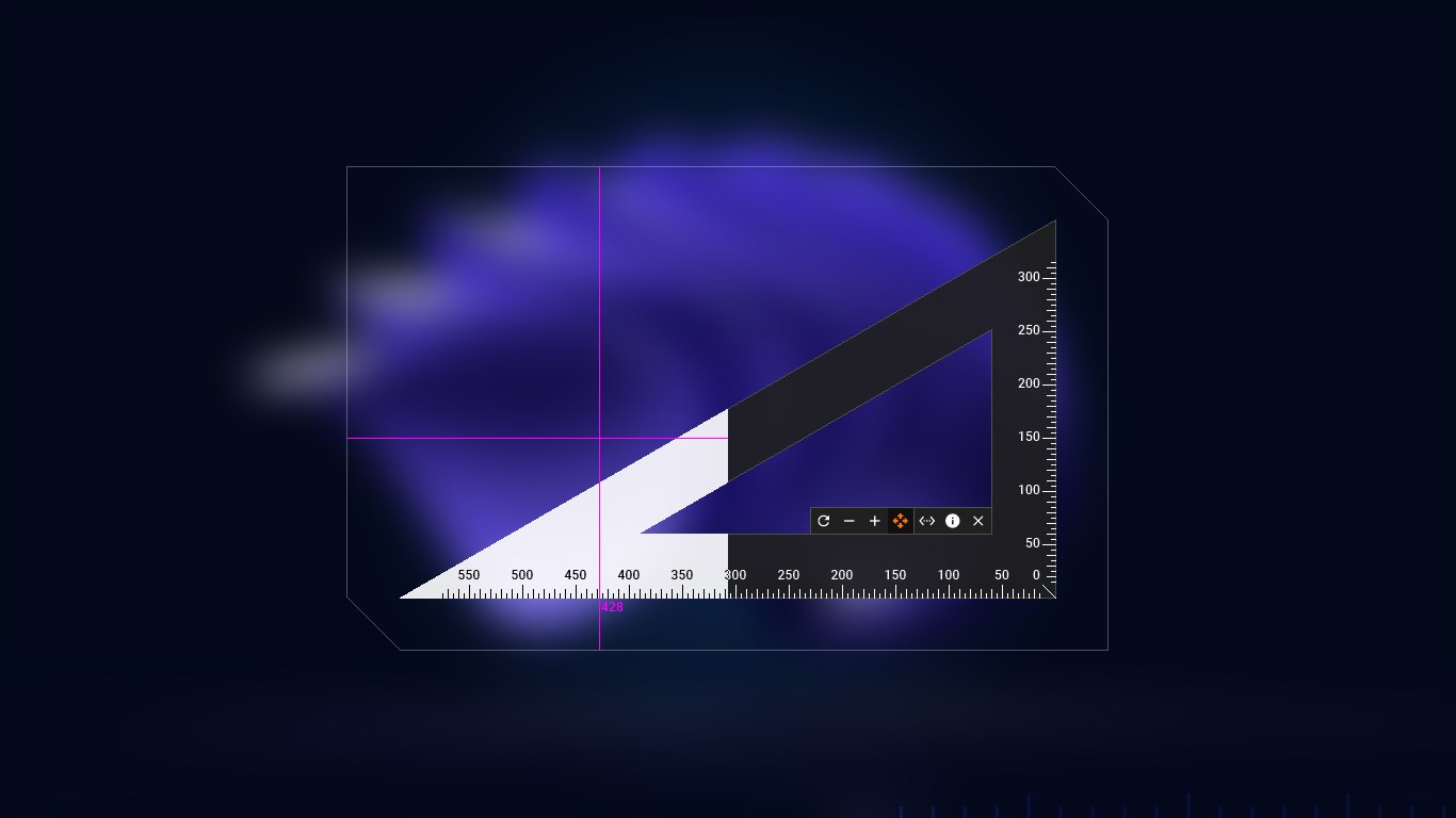 On screen triangle ruler measuring the distance of objects on the screen in Pixels, Inches, True-size Millimeter.