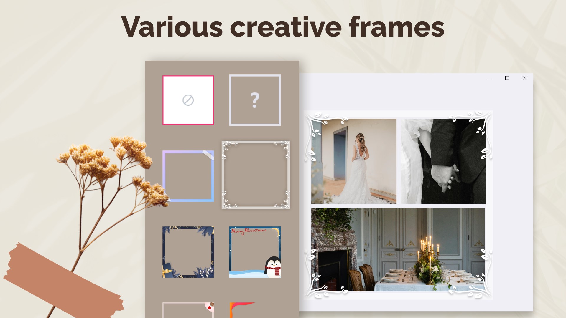There are a lot of backgrounds for your collage: wood, brickwork, ornaments and other colorful ones. You can even choose the color, curvature, thickness and even the transparency of the borders between the photos in the collage!