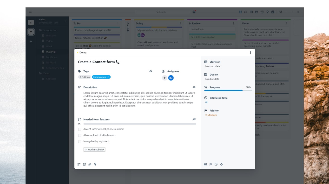 Task automationMultiple document types: Project, Notepad, PeopleDashboardSuper secure - Offline first with no vendor Lock-inHighly CustomisableDark modeWorld View