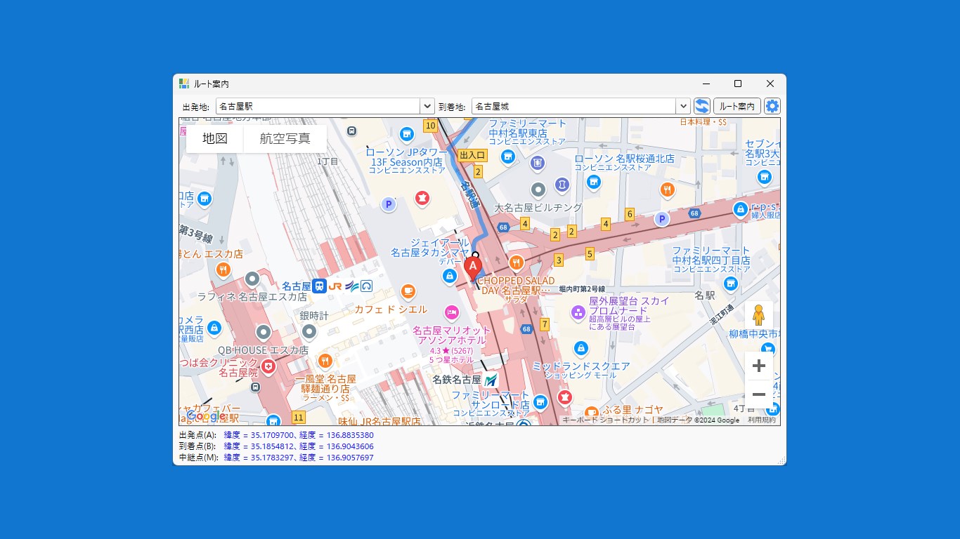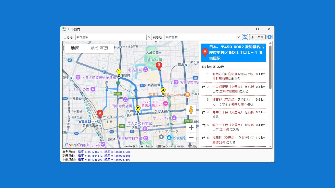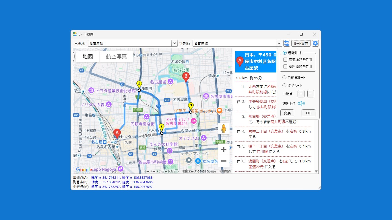 起動して出発地と到着地を指定して、ルート案内ボタンを押してください。