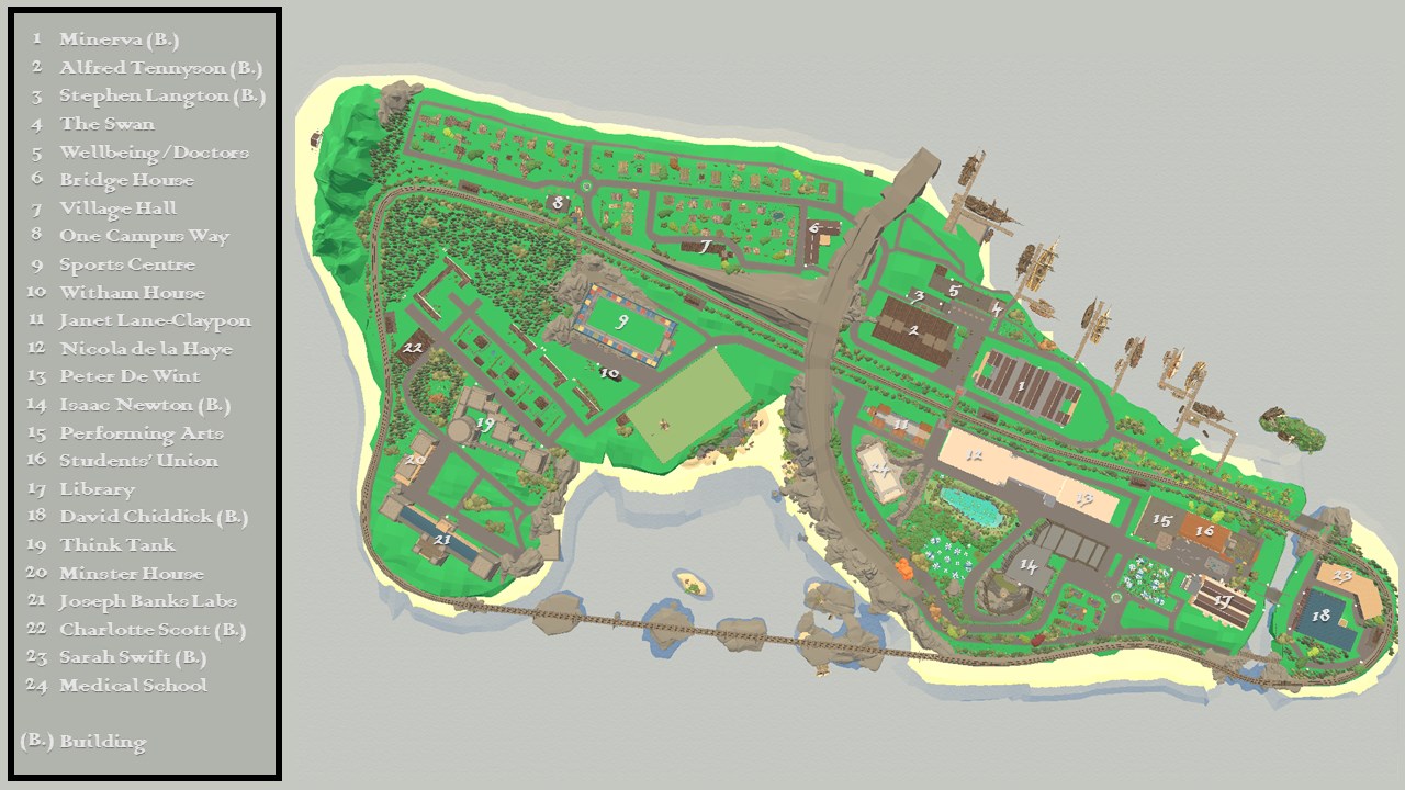 The University of Lincoln Island Project (TULI) was developed to digitally introduce prospective students and the general public to the university's Brayford campus. The aim is to allow people to get a little bit of the “Lincoln experience” through a digital engagement. Through the game, players can get a sense of where everything on the campus is located. Although the buildings are “reimagined” to match their fantasy narrative, they are all placed in the same location, and all the paths and roads are in the same places at the same scale. Put simply, if you can learn to navigate Lincoln Island, you will be able to find your way around the physical Brayford campus. Furthermore, all the AI characters in the game are based on real staff and students. 60 of our current Lincoln students have created their own NPC (non player character) who will tell you about their experiences as a student here. Furthermore, you can find representations of a number of our staff, my colleagues, who will tell you about their role, and give you advice.