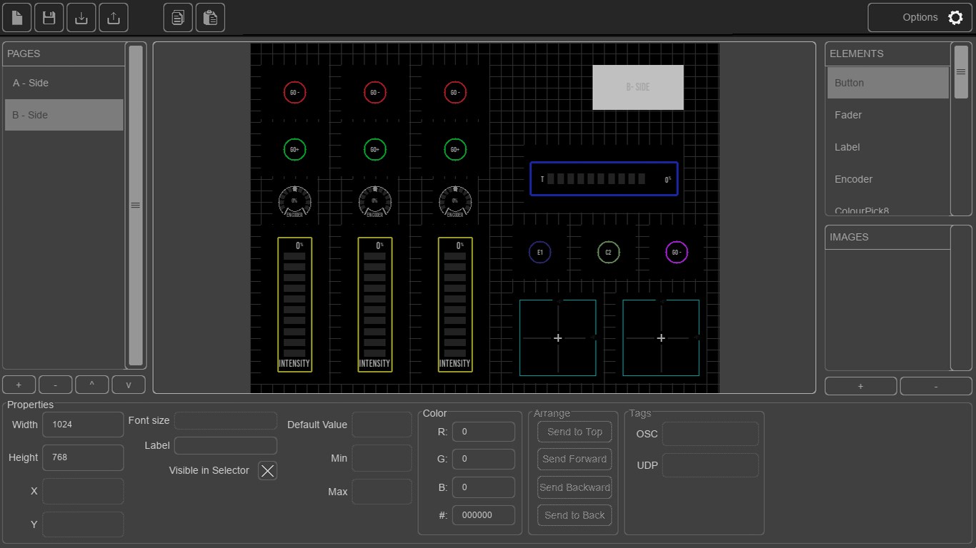 The Kiosc Editor is an editing tool for designing the customization user-interface of the Kiosc App. It offers control elements like buttons, faders, colour pickers, etc. It enables you, to create original and personalized interfaces.