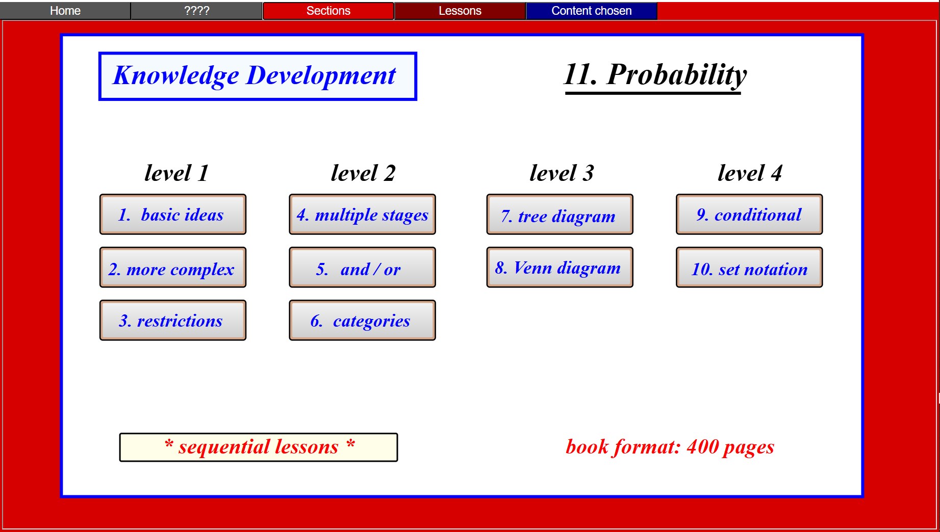 Book 11 begins with some simple ideas and develops them into a set of mathematical skills which can be applied widely in practical settings.