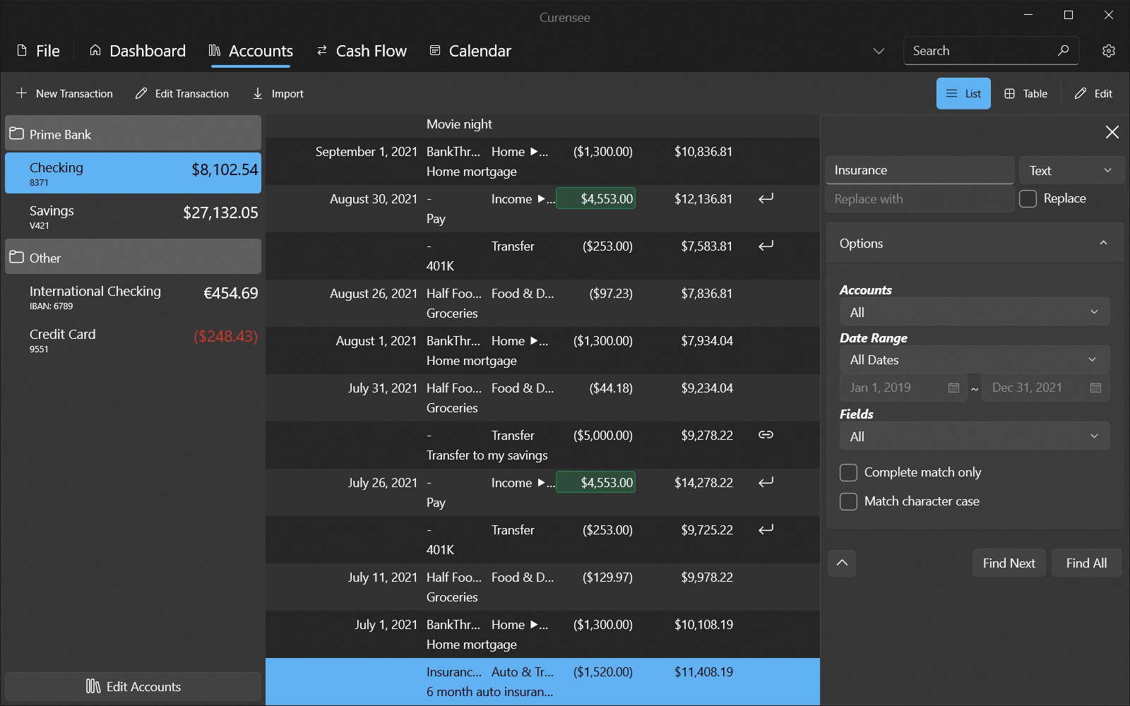 • Link opposite amount transactions together to indicate a transfer (transfers show how money moves between accounts and are automatically skipped during calculations)