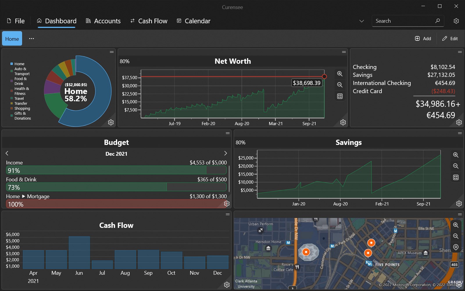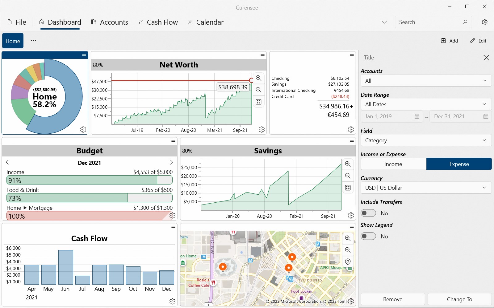 • Customizable dashboard with powerful visualizations including: net worth, cash flow, pie chart, bar chart, line chart, budget, map and account balance